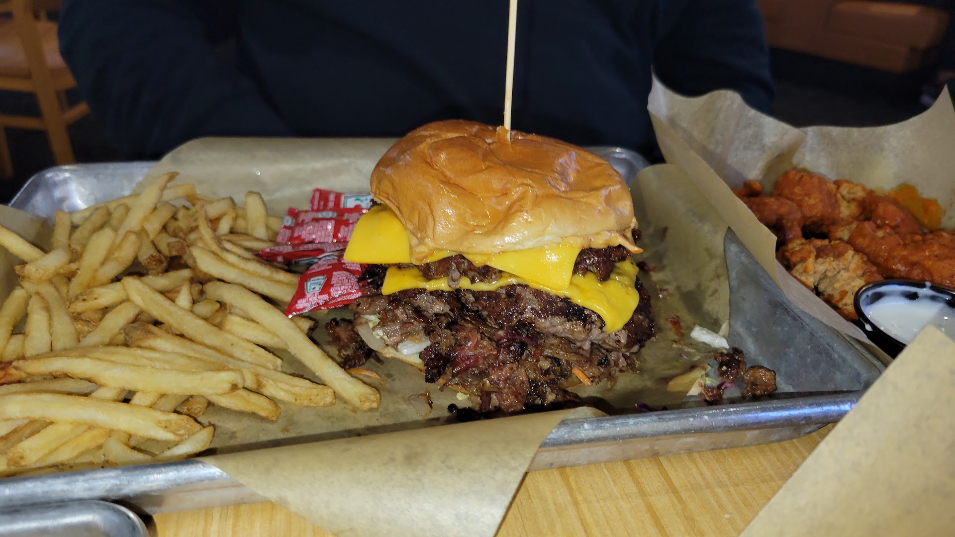 Read moreEvery time we've ordered to-go there is something wrong and it's ridiculous. I can't imagine how this location is still open. This time, my husband orders online. Fries, chicken sandwich, boneless wings. I wait for 10 mins with 3 other people before the manager comes out and asks if we've been helped. Multiple servers just standing around, sipping soda, joking with each other, restaurant is not particularly busy. They see us, we've made eye contact, but they don't come to ask if anyone needs anything. Manager grabs the food, hands out the to-gos and I make my 20 min drive home. I should've gone through everything with a microscope but I really just try to give places the benefit of the doubt every time. Get home, wings are bone-in. I call and 1000% have a tone because I'm sick of it and no one is held accountable. What's funny is the manager said he remembered handing the order to me....so he didn't check it? The manager says he will personally make the wings so they are hot as soon as my husband gets there and puts us in the book for free ones next time. Husband goes to pick them up, employee says she will go get his order, never comes back. Manager comes and asks if he needs help, then goes to find employee. My husband waited 50 mins. The restaurant wasn't even really busy, it's a Tuesday night. But no buss boys, servers are in the weeds, and they can only (literally) scream at the kitchen so many times. Other people come in or call in with problems too. They actually started turning people away at some point. The manager said they are trying to turn the whole place around (it's not working). Husband comes home an hour and a half later. They remade the whole order again since they "lost the ticket". I guess that means the manager never hand made the wings himself. Fries but with random melted cheese and pepper topping this time. Chicken sandwich slathered in wrong sauce and bacon now on it? Boneless wings finally. I don't write scathing reviews, but it's EVERY time. When you hear the manager say yeah there's a ton of issues and the server seriously scream her head off at the kitchen, there's clearly problems. No one wants a $10 coupon, we want it right the first time or even the second time lol....