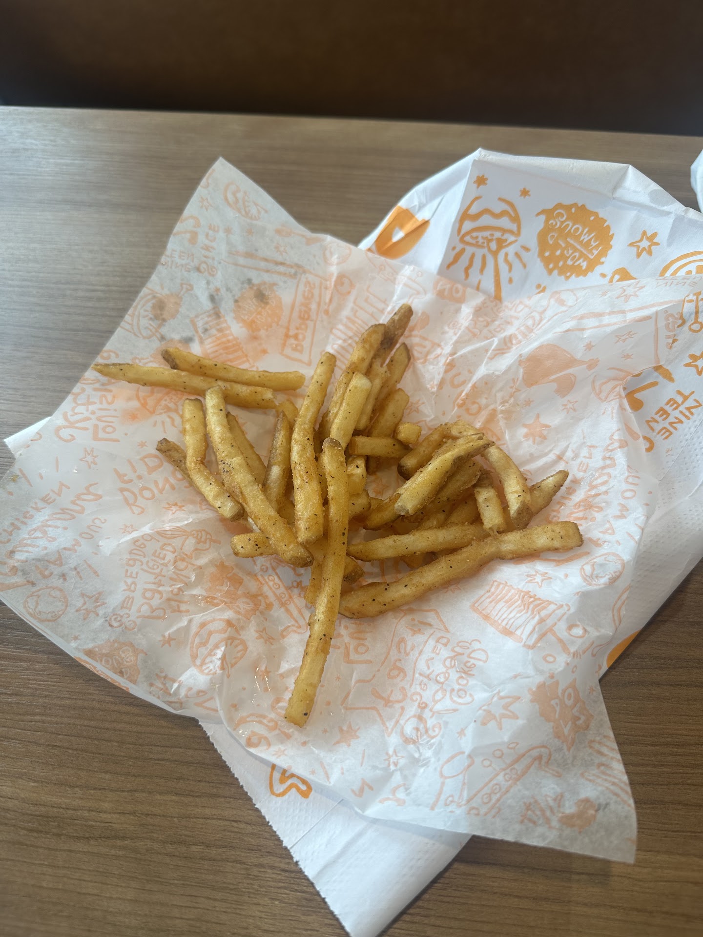 We ordered to eat in (huge mistake) and waited a solid 10 minutes for food that tasted like it had been waiting longer than we had. A cold bun, limp, sad fries that might as well have come out of a time machine from yesterday, and all of it served with the enthusiasm of a DMV clerk on a Monday morning. Fries in parchment paper? What is this, a chicken-themed craft fair? Count the amount of fries we received with the comboâŚ