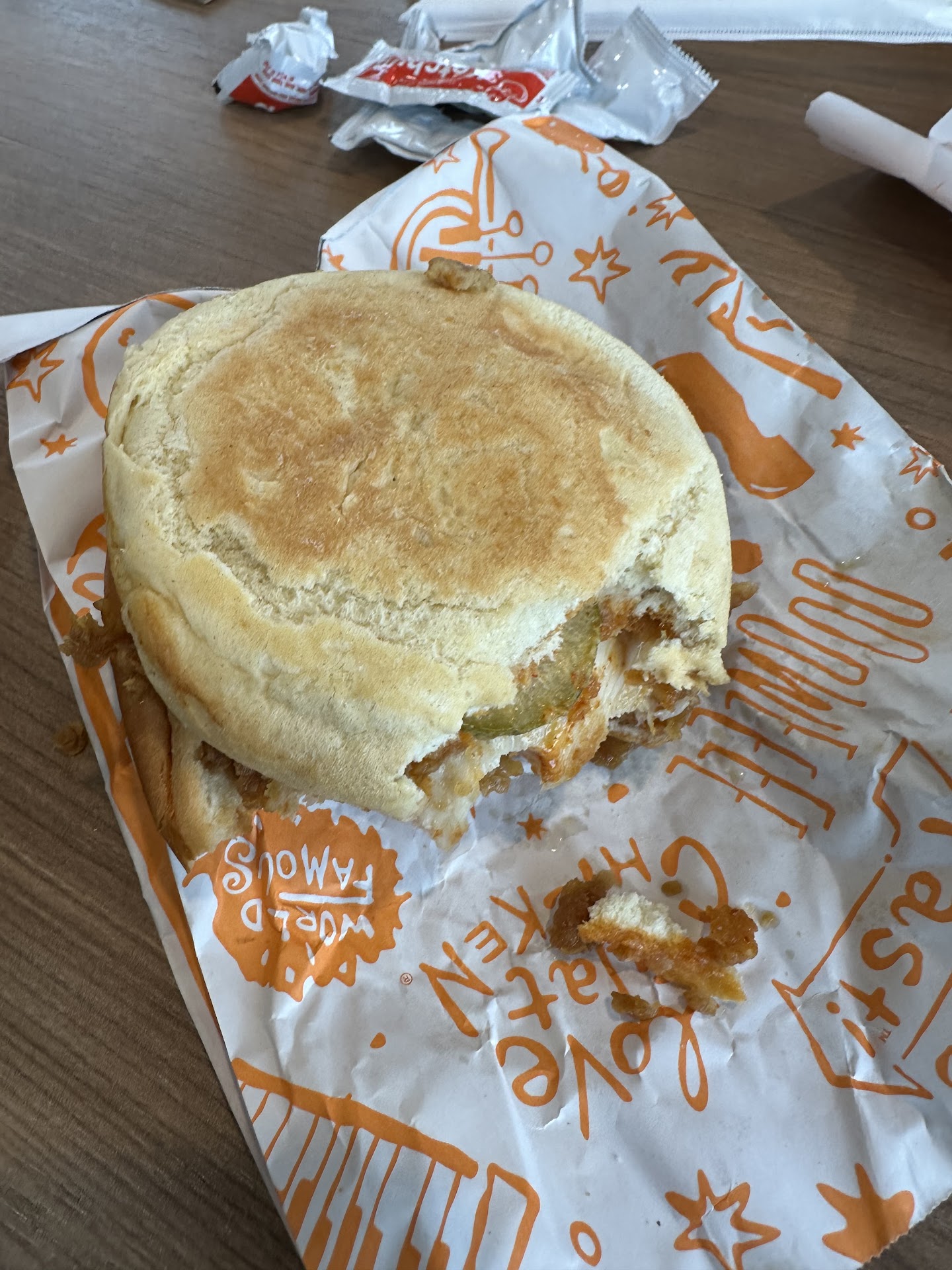 We ordered to eat in (huge mistake) and waited a solid 10 minutes for food that tasted like it had been waiting longer than we had. A cold bun, limp, sad fries that might as well have come out of a time machine from yesterday, and all of it served with the enthusiasm of a DMV clerk on a Monday morning. Fries in parchment paper? What is this, a chicken-themed craft fair? Count the amount of fries we received with the combo…