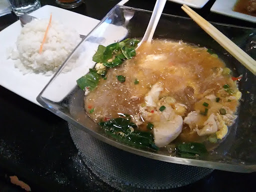 I ordered wonton soup, but they didn't have it so I got tom yum. Spring rolls, and beef salad. The Tom Yum was bland and didn't really taste 'Tom Yum'. One of the hallmarks of Tom Yum is you get sticks and leaves and grass... All kinds of little bits and pieces. This has none of that. Just a clear broth. Throw some wontons in there and I could have had wonton soup. Very disappointing. It also came with noodles which I thought was strange.
