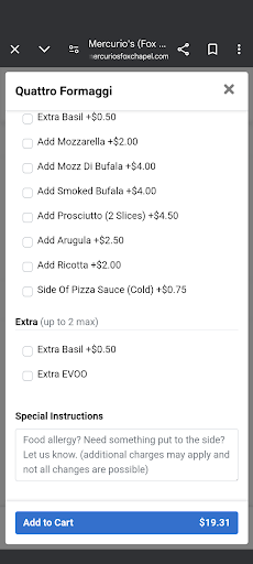 Read moreMany different gluten-free blogs and pages recommended Mercurio's for top notch gluten-free pizza, so we decided to test it out. Placed an order online for two pizzas and there was not an option for gluten free dough, so we politely requested it in both the special instructions for each pizza and the special instructions for the whole order. Total came to $50 including tip, expensive, but it's gluten-free so that's expected. Checkout screen let us know there might be some extra charges on arrival, not a problem, we expected a few bucks.