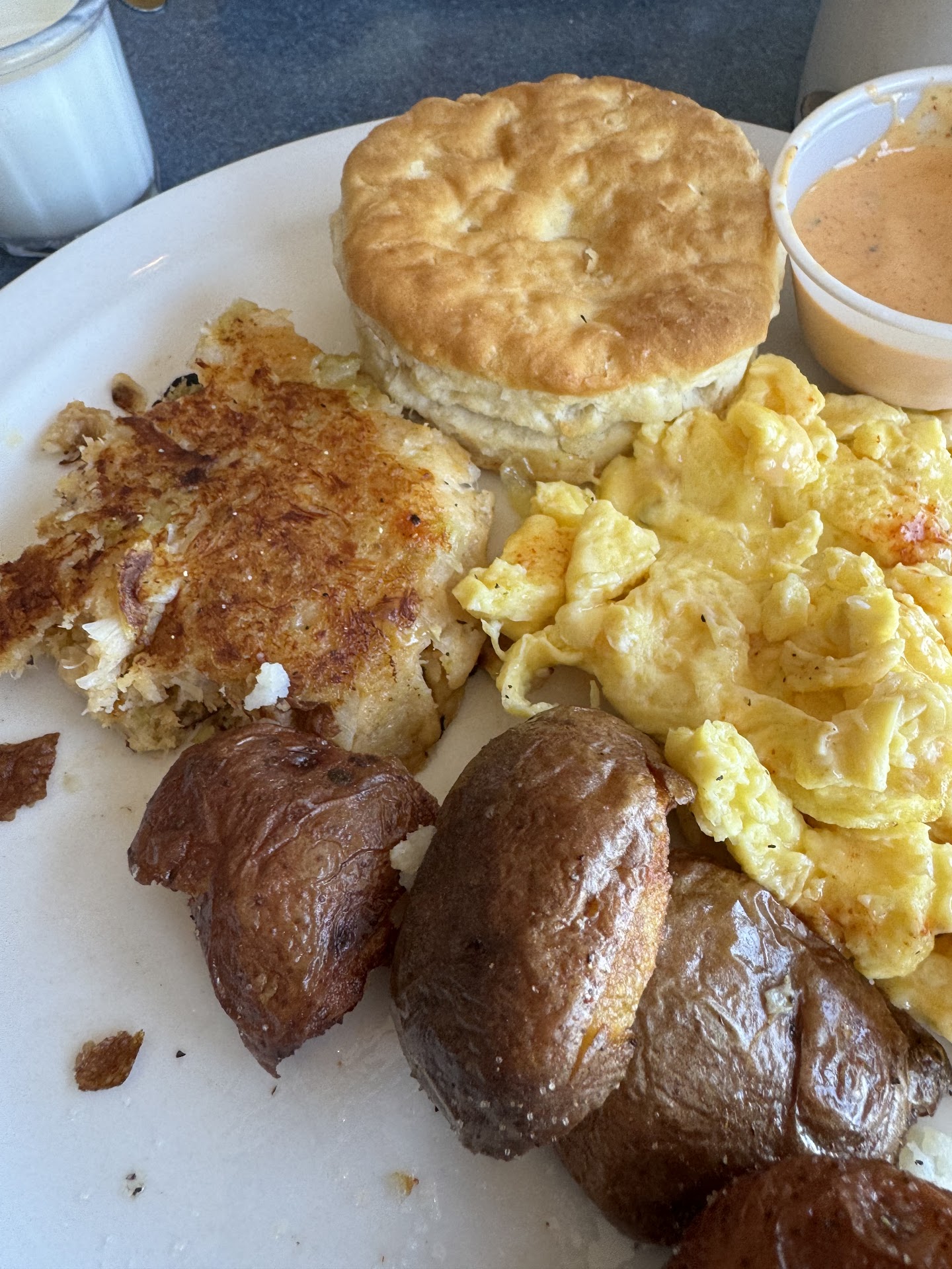 My eggs were cooked perfectly. The home fries were whole, new potatoes which were thoroughly cooked and somewhat crispy. I asked for crispy bacon which was just crispy enough. The biscuit and gravy were delicious, however, I could have used a slight more gravy.