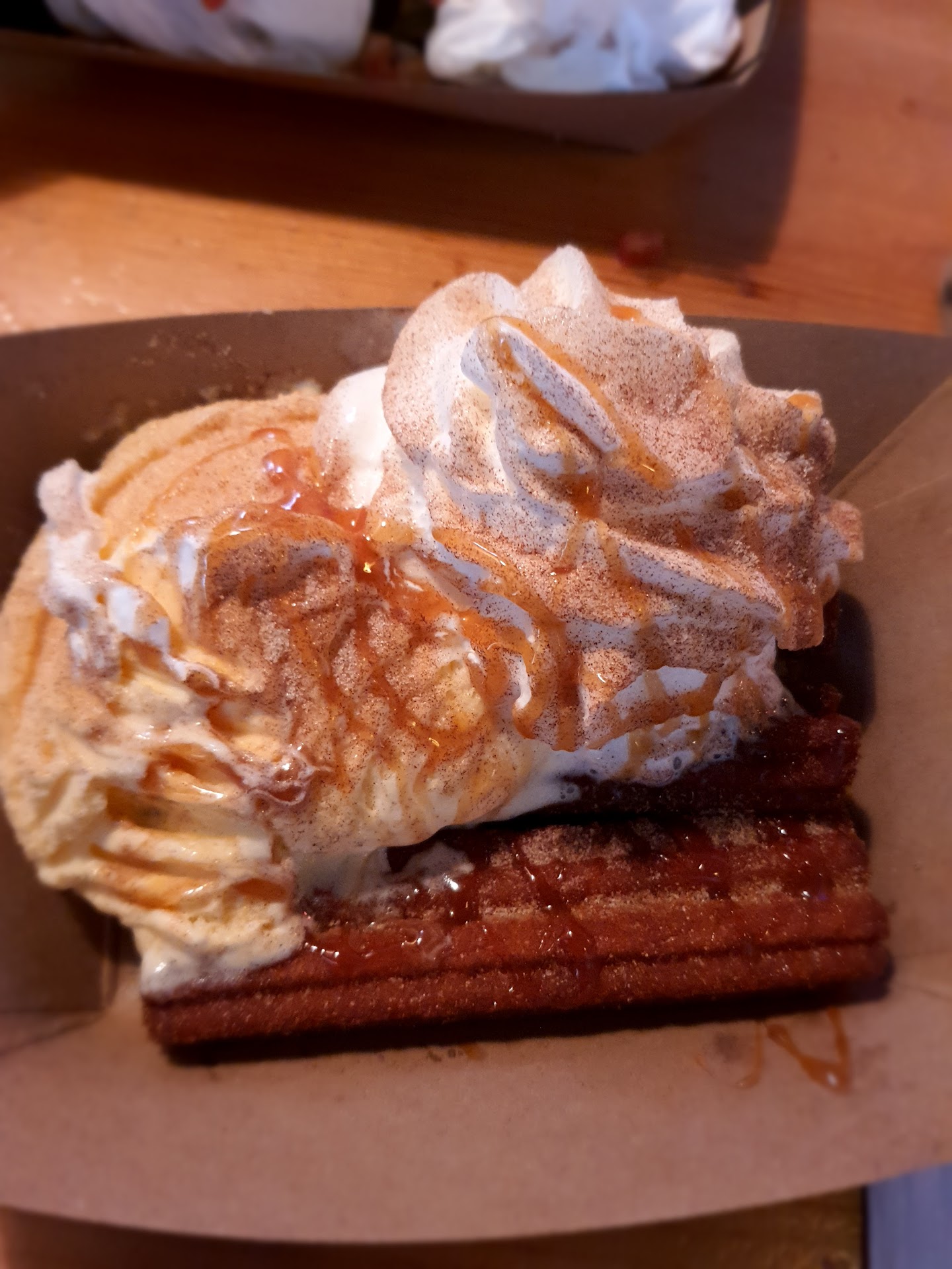 While walking by, it looked too good to pass up! Seated right away which was nice considering the Vineyard was packed this weekend! I had the fish tacos which were pretty good... The only thing I didn't know & didn't see on the description was that were hot peppers on them, which I picked off, but it'd been easier had I known they were put on, bc I'd have just requested to hold them. The fish on the tacos was amazing! Super crispy and tasted delicious! Unfortunately, I didn't like the sauce they were doused with. It was good at first, but then got sickeningly sweet, and as I finished the first of two, I couldn't eat the second one because the sauce just got to be too sweet, and normally I love sweet, it was just TOO sweet, like food sweet, not like a pastry or candy sweet if that makes sense. Next time I'd ask for the sauce on the side and if you're not a sweet sauce person, I'd Def make sure to get it on the side. I also had the drink special, Watermelon was the flavor of the day, marguerita, it was very good, refreshing, but small for the cost and hype, as I was expecting a big fancy watermelon filled drink. It was delicious though and definitely not the usual pre-measured very little alcohol and drink mix you'd get at one of those chain places, thankfully! So it made the price worth it, I just wish it was a little bigger... I'd guess it was a 6oz plastic cup, with ice, so maybe 4oz of actual drink. 8-10oz plactic cups at least would be better. The final of the meal was omg!!! The apple caramel filled churro I think they were called... Were soooo good! I got 2 with ice cream and she brought 2 spoons, for my best friend to dig in?? Lol, I told her, you may be my BFF, but if you pick up that spoon, I'm picking up my fork and not to use as a eating utensil 😉😂 I don't share well when you can very well get your own! Lol! And I ate it all with no help and no shame lol!!! And funny enough, these are the ONLY pics I took that...