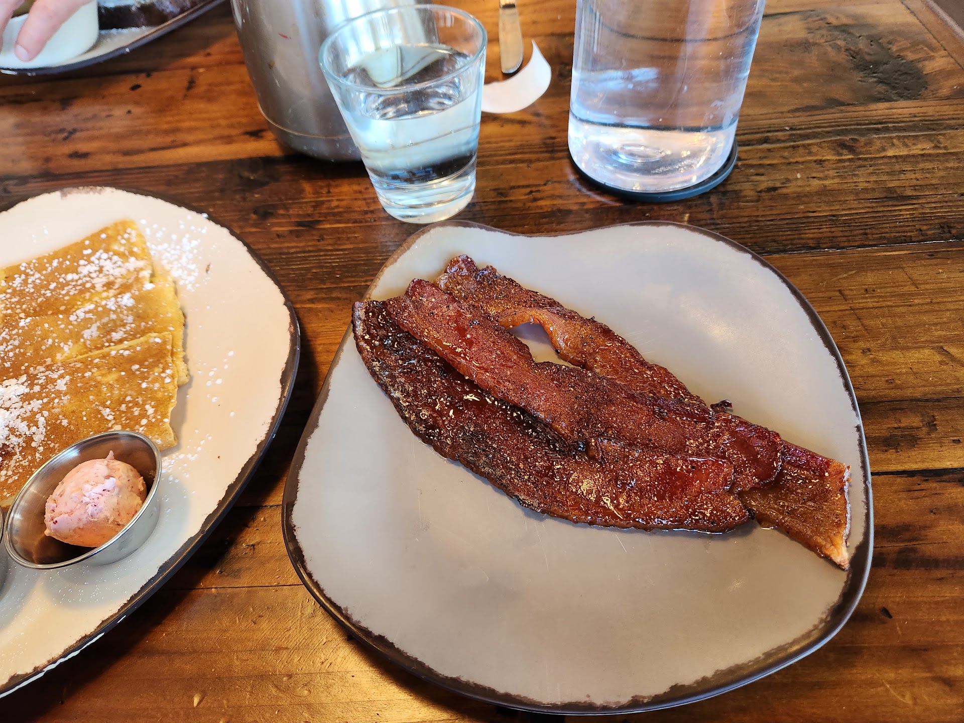 My husband did not like the banana bread French toast/skillet combo. He said the banana bread French toast was just banana bread with bananas on it. There was nothing making it French toast. It wasn't dipped in egg and cooked. It was just a slice of banana bread. And he felt it was overly sweet. He did like the little bowl of fruit, however. And he did enjoy the very small bowl of skillet. I had some chicken rice soup, it tasted like premade rehydrated soup. It wasn't terrible, but it didn't taste from scratch. The chili was not good. Swedish pancakes were good, but I've had better. They came with lingonberry butter and lingonberries on the side. None of the breakfast dishes we had came with bacon or sausage. I felt the dishes were expensive for what they gave us. I had a cappuccino, which was good, but there was barely any foam. It was just liquid. I've had some amazing cappuccinos, so I was not impressed with this one. We ordered the bourbon maple bacon, and I thought it was delicious. It kinda had the texture of jerky, though. Reminded me of a brown sugar ham I had at someone's Christmas dinner once. My husband couldn't get over the chewy texture or syrupy sweetness of the bacon. He likes bacon to taste like bacon, so I guess it's not for everyone. One thing I did like about this place was that it had soothing music and it wasn't too...