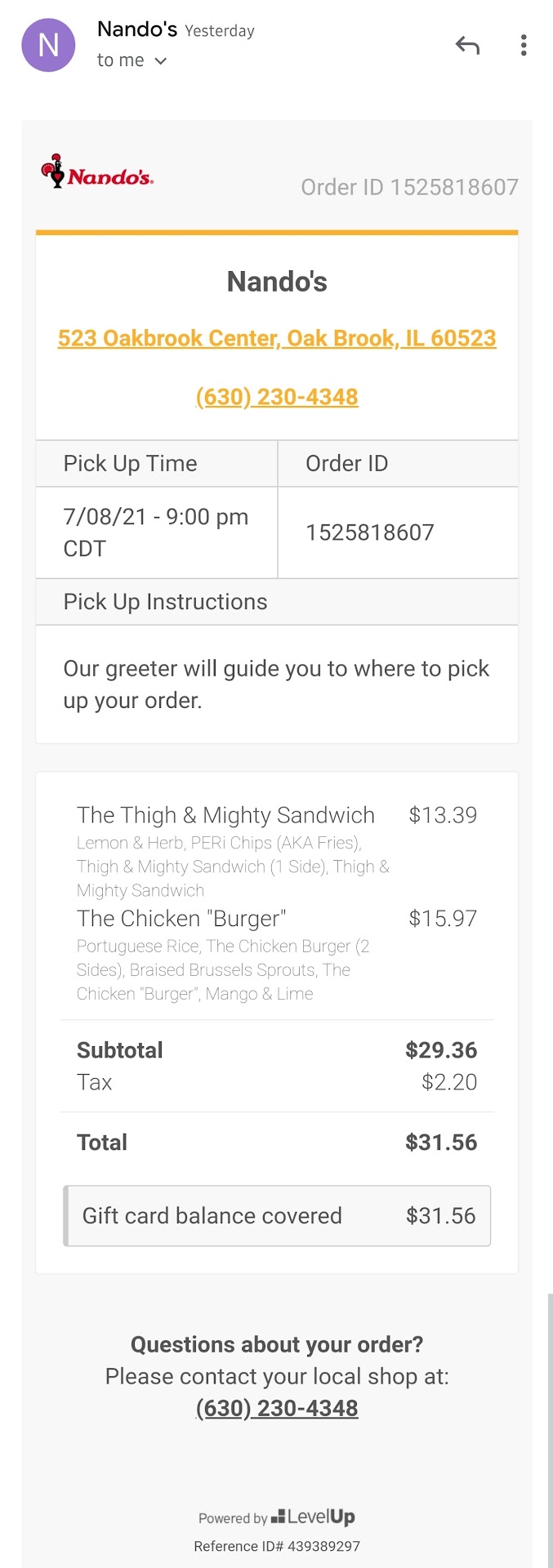 My fiancée and I eat at Nando's quite a bit and we almost always get the same thing because it's consistently good. The thigh chicken sandwich! Wow! But last night we went there and everything was HORRIBLE! The chicken was burnt and overcooked, it smelled like burnt plastic if you every smelled that, the fries were not crispy and horrible and not seasoned like we like it, we ordered on the app for 9pm and we got there at 8:52pm and asked if we can actually change it to dine-in cuz we were hungry. Then the young slender lady with short green hair (at the oak brook location) said that next time I should not order ahead but just being the app so that we get the rewards still and do it at the register. I said thank you and I understand and I was polite about it and told her that we were just hungry and didn't want to wait for it long. Asked if we could get a seat and if we can change it to dine-in. She said she wasn't sure and did not think so because there weren't many tables left.