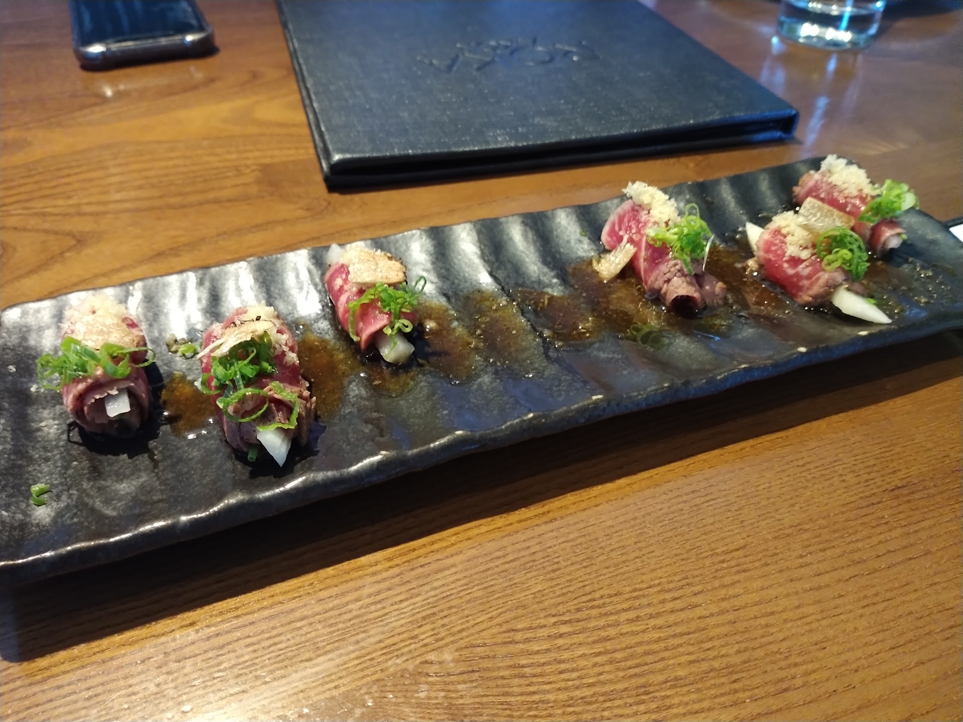 So let's start with the Tataki beef for appetizer. $22 for prime cuts of beef with truffle and pickeled daikon. In a fine dining restaurant, you want to make an impact on the customer with the first bite. This didn't leave any real impact other than very overpowering truffle and a rather boring soy sauce vinegar mix. I will say though the beef was fantastic and probably would have tasted better without all this hoopla.