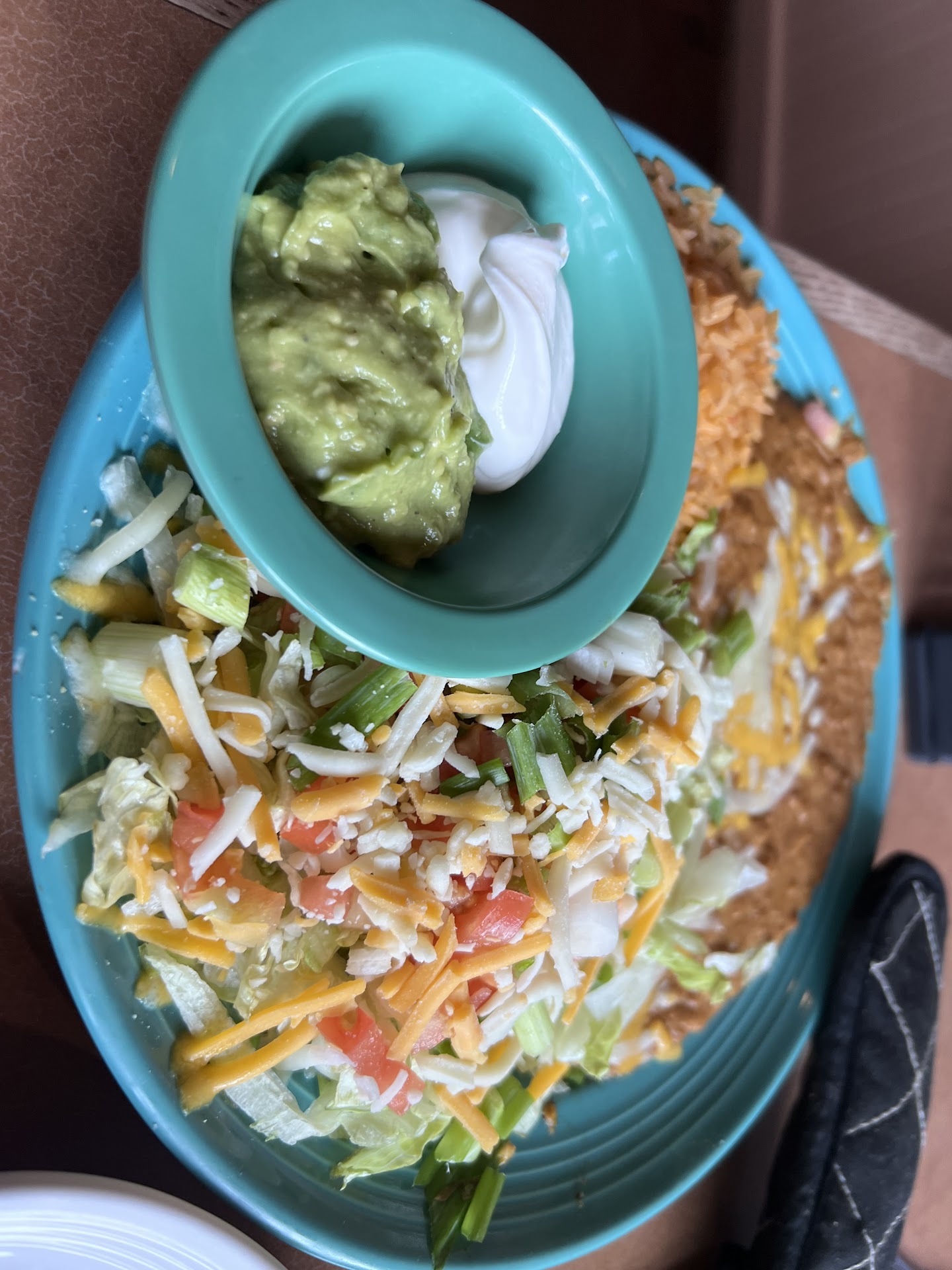 The waitress took it back. Ten minutes more where my party is over half down eating thier own dinners out comes my burrito . Minus most green onions still a few.... They took off the toppings and green onion instead of remaking it. Fine what ever don't waste food. But my beans and rice at this point were dry from I am guessing being put under a salamander to melt the new cheese on the burrito and the burrito had no Mole sauce on top! They took it all off when they took off the green onion. I made my order purely on the Mole sauce which is yummy.