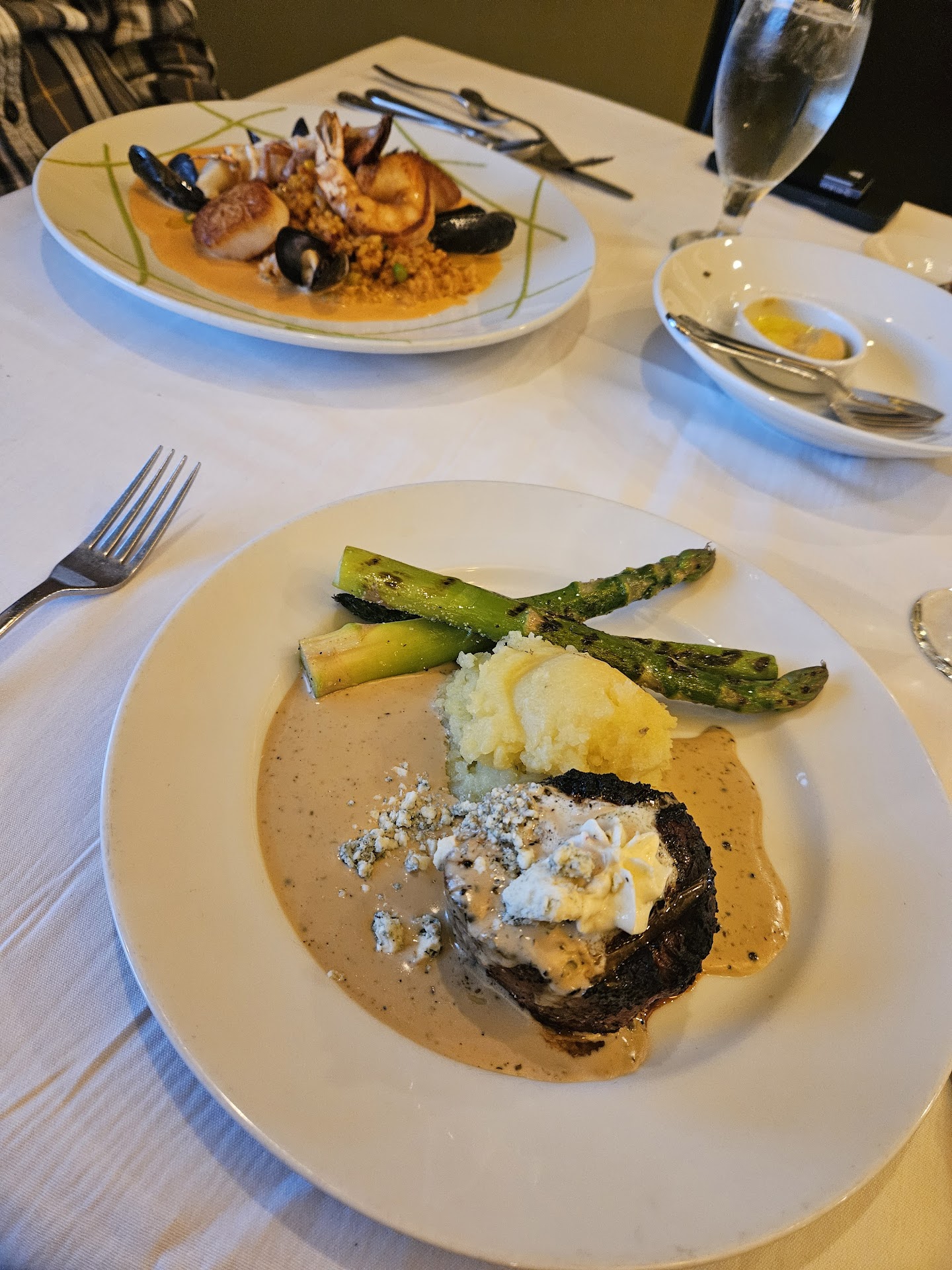 Food: Excellent, but not exceptional. Flavors all blended very well with the exception of the shrimp/crab lasagna. Table agreed the crab had a taste that took away from what was a great idea. The mussels were fantastic and the two different cuts of beef the table ordered were cooked well and very tender. Old Fashioned’s had by all were very cloudy. Ordered two desserts, the flourless cake and vanilla creme brûlée. Both okay.