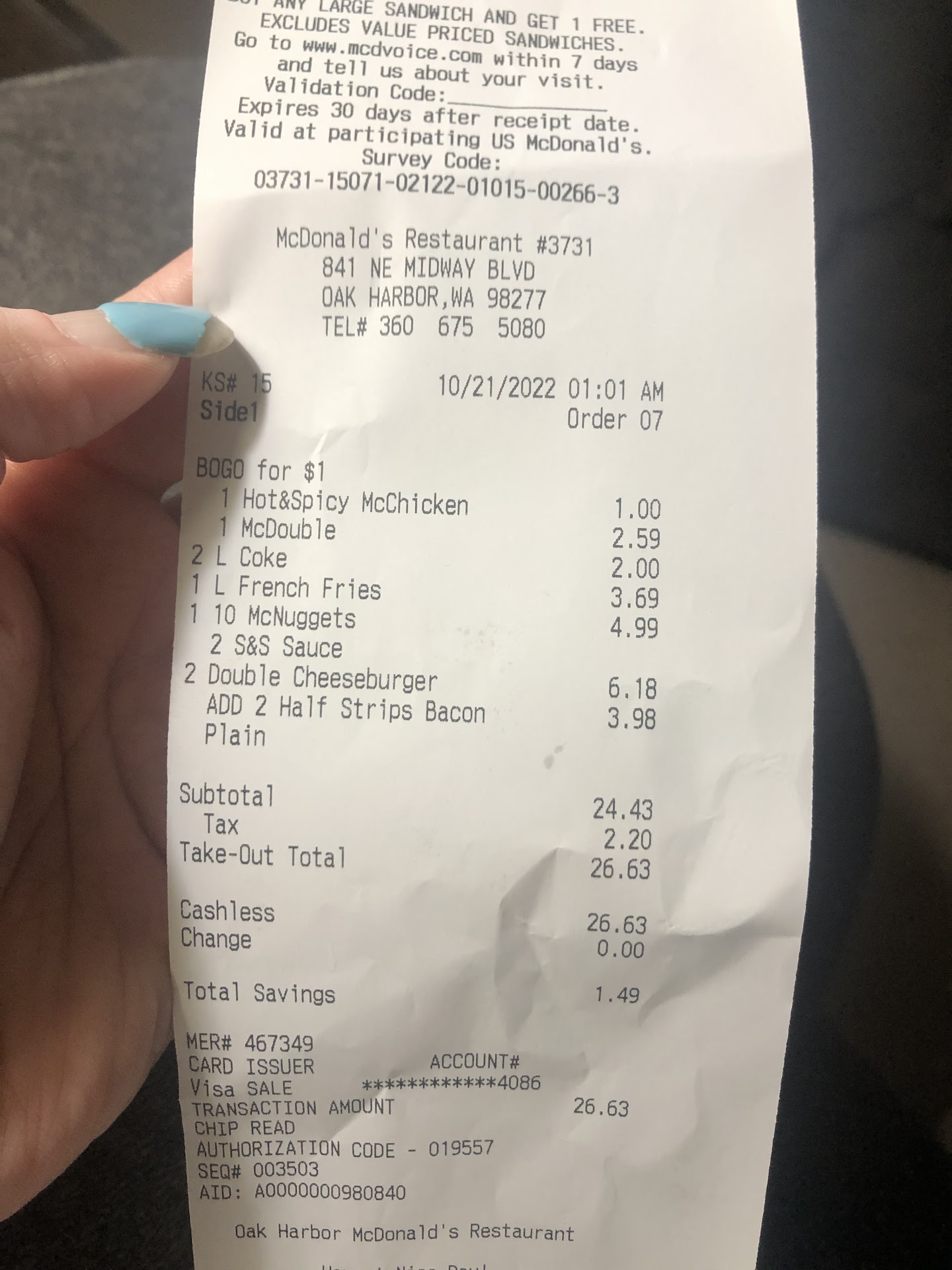 Read moreWe had a horrible experience at this McDonald’s. We went through the drive thru at 2:01 pm and ordered two Quarter Pounder meals with coke. Easy order, right? Get to the window to pay, then the next window to pickup and they tell us to pull to the side to wait. There were 3 other cars pulled over to wait also. We waited 20 minutes and our order finally came. I instantly checked the bag to make sure that everything was there and tried one of the fries. The fries were cold and stale! So my husband went inside and explained that we waited 20 minutes in the drive thru lane only for our fries to be stale. He asked for fresh fries or a refund and the cashier instantly threw money at my husband and a refund receipt instead of just fixing the issue. First of all, it’s a drive thru. If you have to have everyone pull out and wait for their order then it defeats the purpose of a drive thru. And second, the fact that they screwed up and didn’t even try to fix it clearly tells me they don’t appreciate my business. So we pulled out, went next door to Taco Bell, ordered tacos, had a pleasant cashier, our food was hot and ready by the time we got to the end of the drive thru and we didn’t have to wait. Taco...