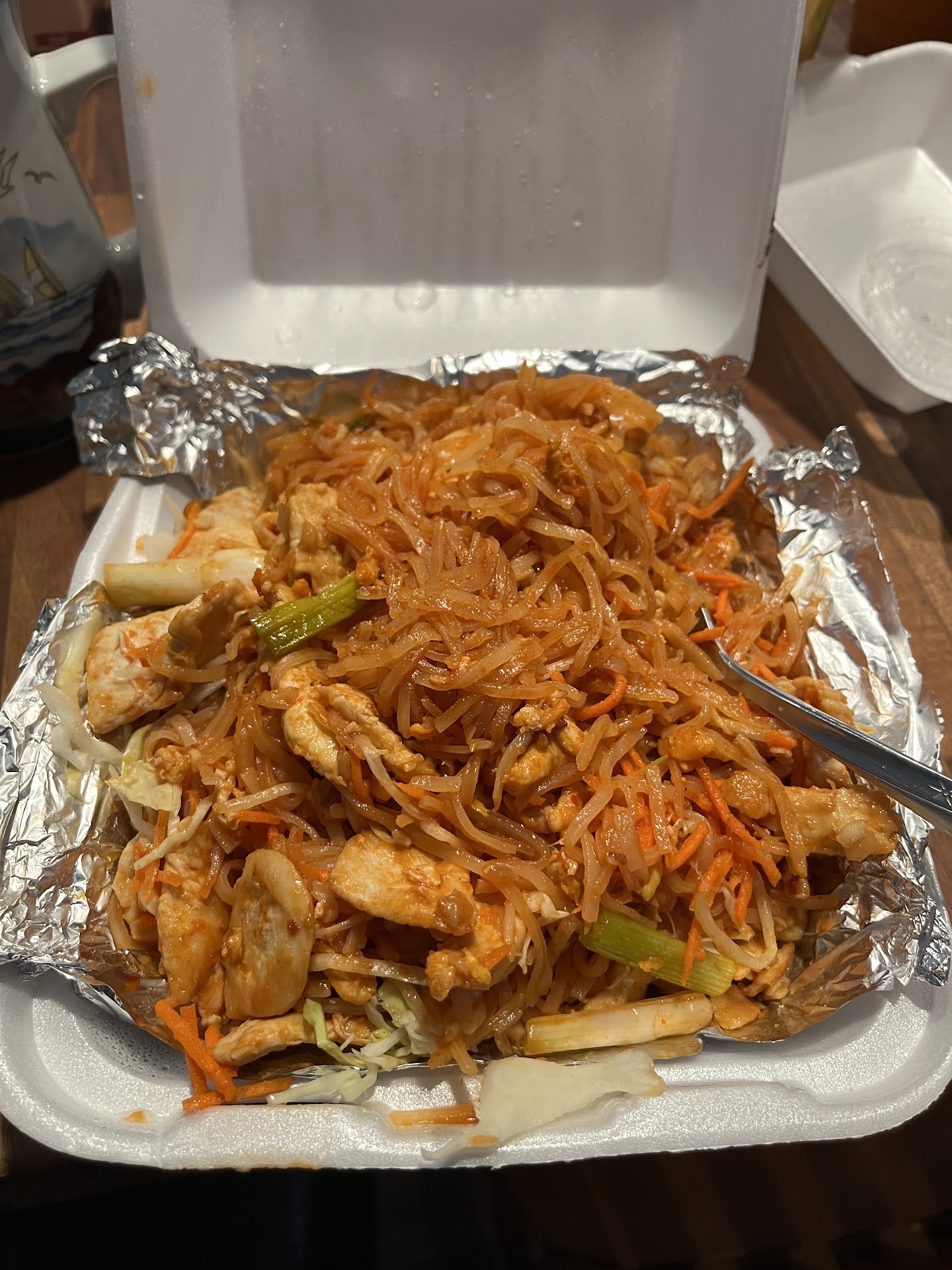 The first time I ordered, the system said 20 minutes. I added another item and the wait changed to 45 minutes, no problem. I arrived right on time, but it was clear the food had been sitting out. My nephewâs pad thai was lukewarm and stuck together in one big lump. The coconut shrimp was also lukewarm but still tasted fine. I had paid $4 extra for added veggies in two meals, but neither dish had what looked like even a regular portion, let alone extra. I figured they just forgot. I chalked it up to âstuff happensâ - disappointed of how expensive it was, but not enough to call or complain.