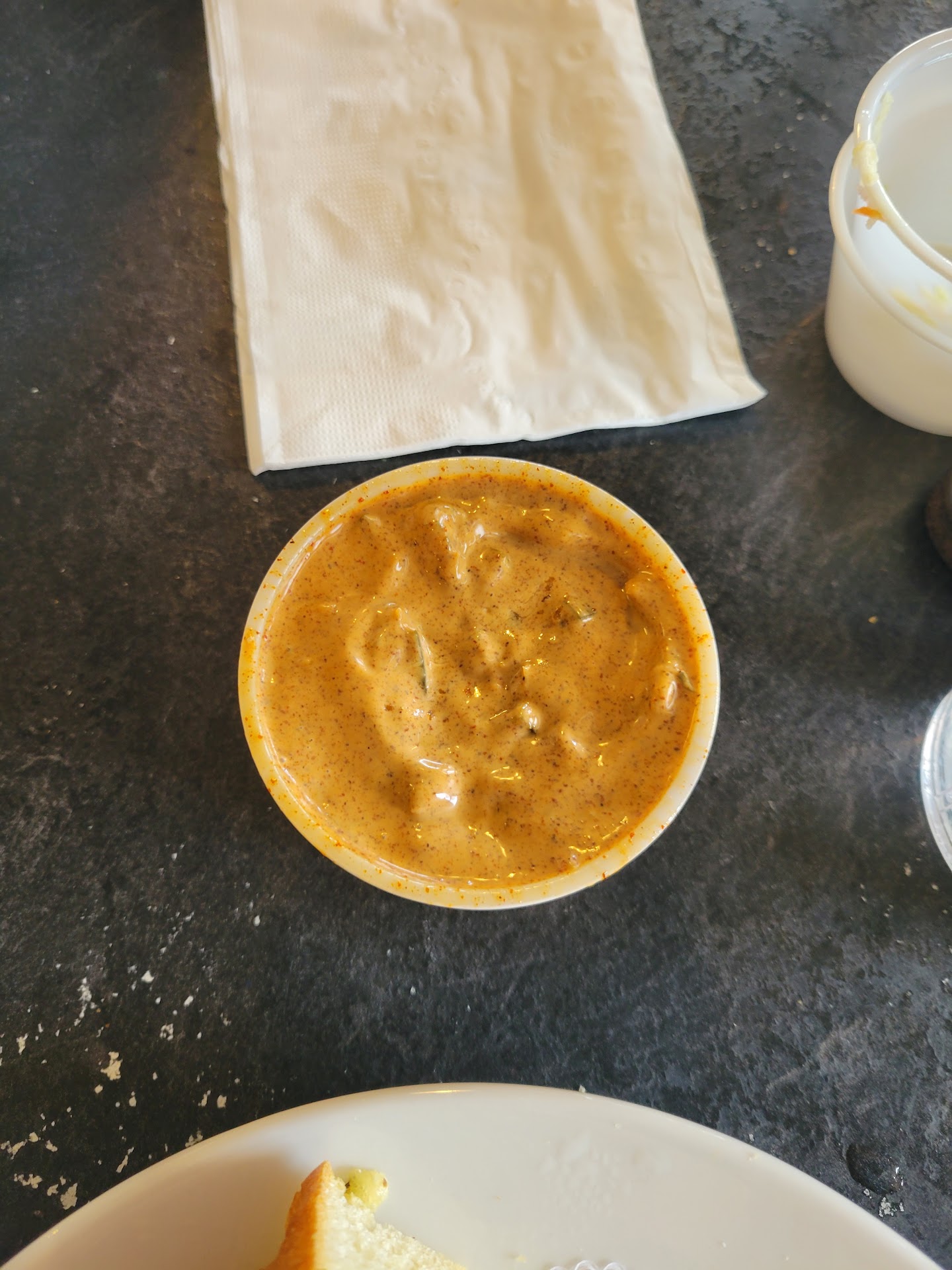 Around 10-15 minutes later, I received my cup of soup. Shortly after, we got our orders. First off, they advertise "beer battered" seafood. As you can see from my pictures, the fish was almost battered in... Shake-'n-Bake. It was heavily breaded in a panko/breadcrumb like crust. It definitely wasn't what we were expecting. The fish itself was overcooked, and the oil definitely was a day away from being shot. The clam chowder was pretty decent, thankfully. The chili lime tartar is WAY overly seasoned and almost gritty. I included a photo. Definitely not what I was expecting. It doesn't pair well with fish. Their regular tartar is very good.