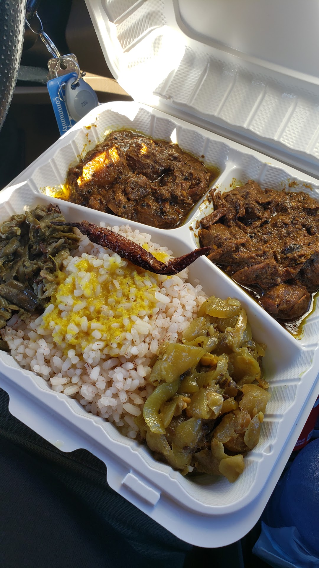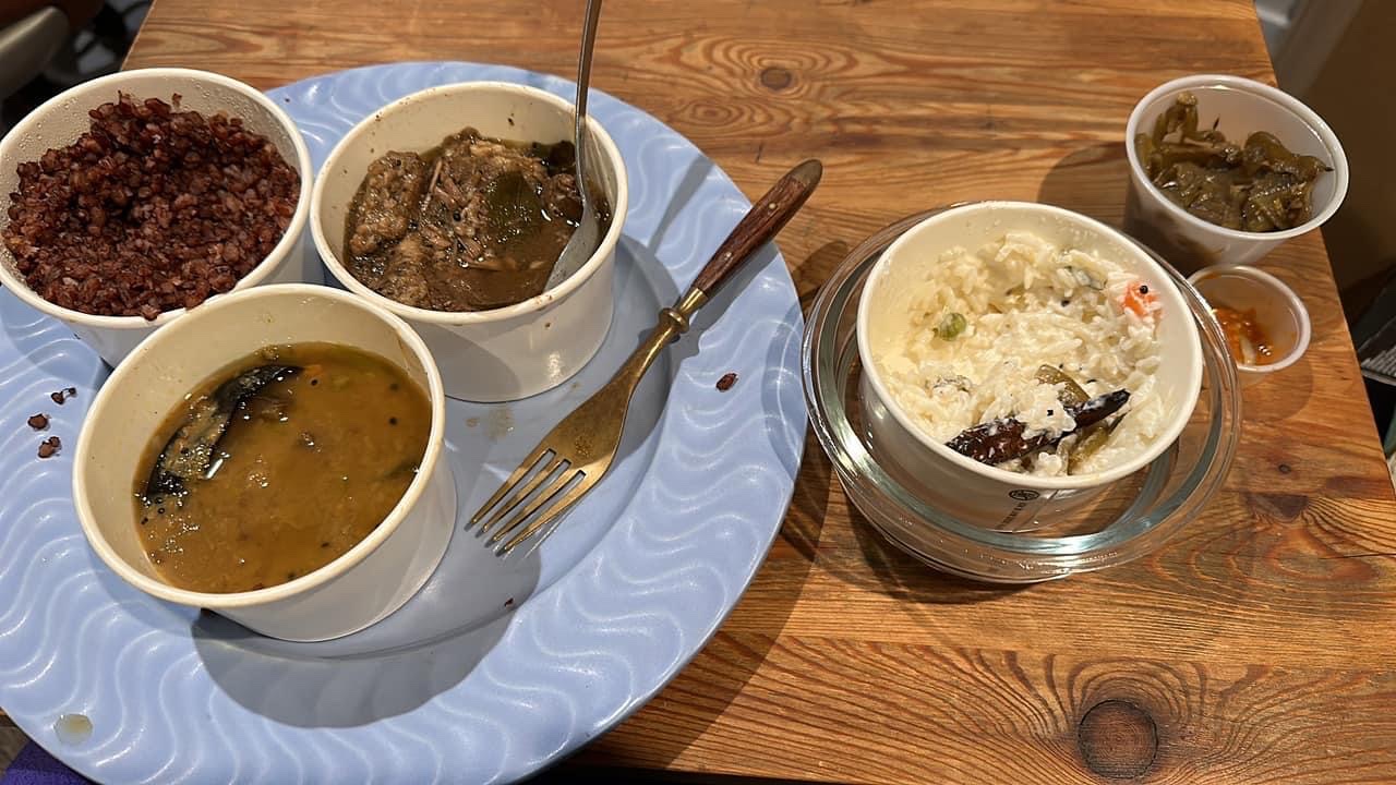 The flavors are so mild and delicately balanced. There were a lot of vegan options, but I got the curd & rice (cooling flavors in yogurt and rice with pickle sides), delicious beef, a special vegetable stew called Sambar, and a cool Indian rice high in vitamins. It’s Southern Indian food, which is lighter and very different than the Northern Indian food at most other Indian restaurants in the US. You can mix and match small containers like this to create a healthy and easy quick to go option for the whole island. I also got a delicious unsweetened chai, but I can’t wait to go back so I can try the special...