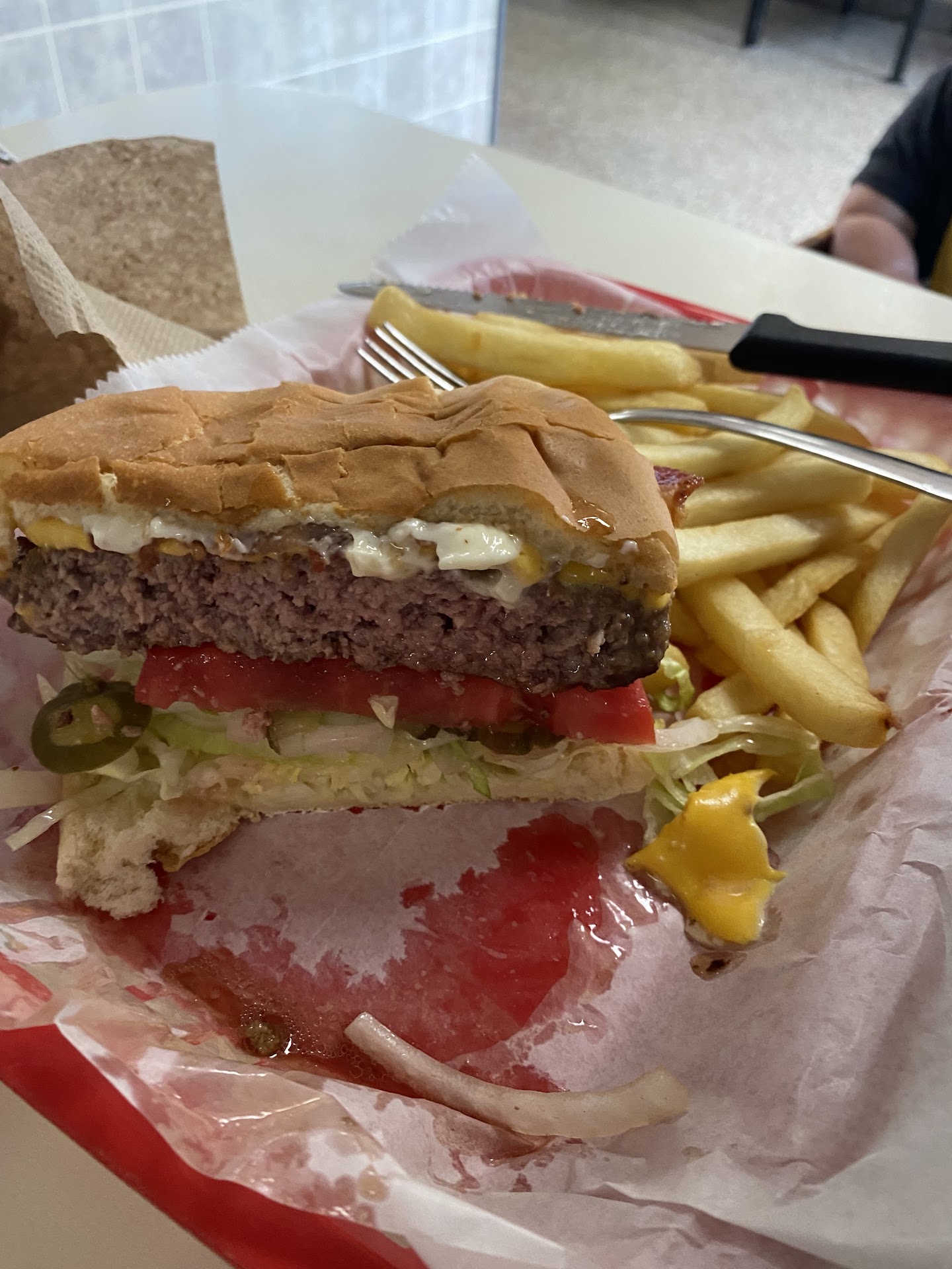 As for the food, I was in the mood for a burger and boy this did not disappoint! What a phenomenal burger, it was simple and no frills, a handmade cheeseburger with mayo, lettuce, tomato, onion, ketchup, and some bacon. You can get some other varieties like chili cheese burgers and all. Nothing too out there or experimental, but it was executed perfectly and we all enjoyed our burgers immensely. We did get large burgers, I was talked into it, and they were legitimately huge! I couldnāt quite finish the whole thing but not for lack of trying. Next time Iāll definitely order the small. All in all, the burger hit the spot and then some.