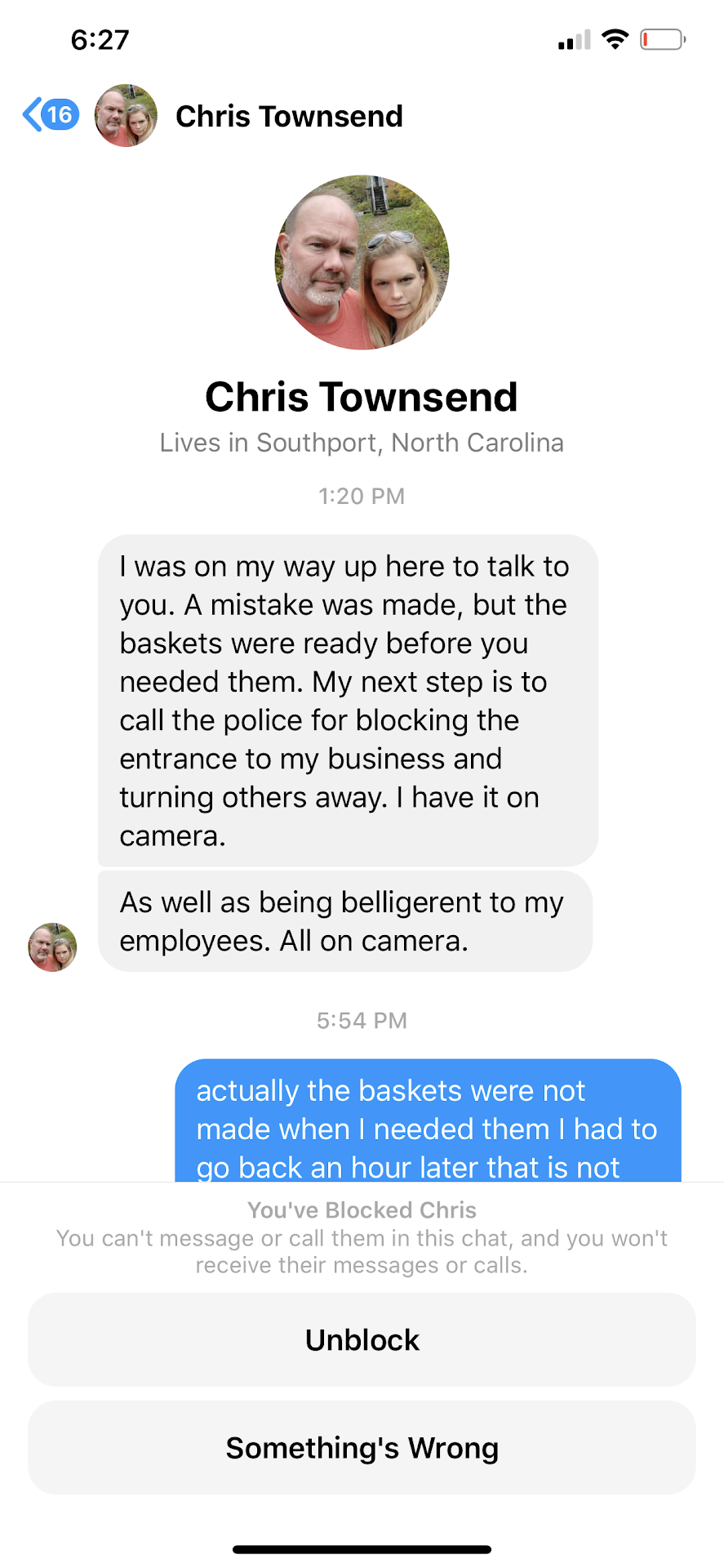 Thursday I ordered baskets for our local police departments. The baskets not being ready and the employee knowing nothing about it... that’s not even the beginning! I made a post on facebook to let the owner know what happened. I then got told I was lying. I’m just lying on a company that I have no history with. That doesn’t even make sense. He even told me if I post this on local sites, I would get ripped apart. So I am writing this review. The owner did not answer his phone from first employee. And then attacked me after I wrote the review. He stated he had cameras. I would love to see and hear those cameras and an apology. I’m kind of in shock that I got attacked, so I really do not know how else to address this. I’m not sure why any owner would attack the customer who was not getting nothing out of letting him know. But yet here I am. I got attacked for writing a review and telling the truth. I did not ask for a refund. I did not get a discount. I paid full price for my baskets. I was just trying to let an owner know what happened in his bakery today. He started his message to me saying, “i got my baskets when i needed them” this is not true. They were supposed to be ready at 10 and they would of never got made if I didn’t tell the girl about them myself and go back out of my way to pick them up. AND MIND YOU, read his first text messages: we had five baskets and had to carry them to car. That’s why door was held open. And blocking customers??? Was I not a customer? Obviously I think we see who’s...