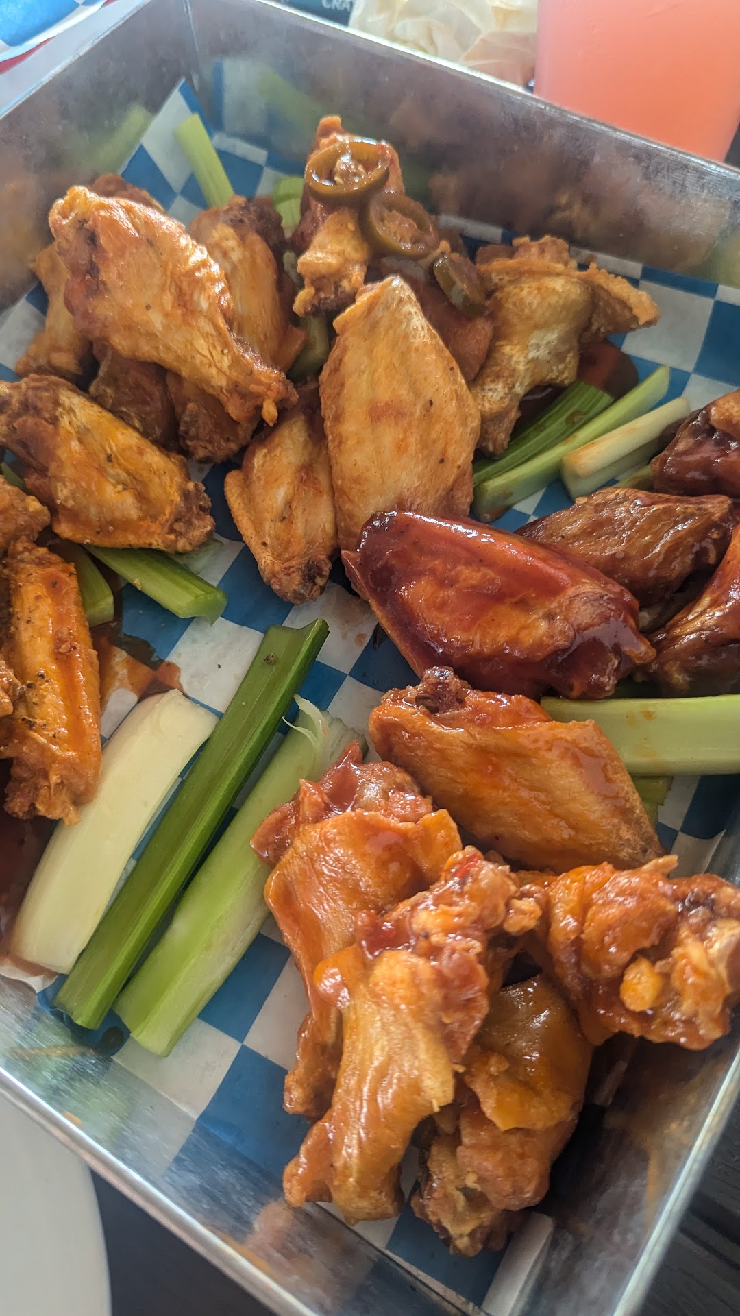Entrée two- 12 wings- 6 mild snd 6 garlic Parmesan- The mild wings were so spicy that they were in edible according to the person who ordered them. When we asked the waitress, she said, sometimes they make them a little bit more spicy and if we would like, she could bring out some more ranch dressing. The garlic parm were overcooked and too tough to eat.