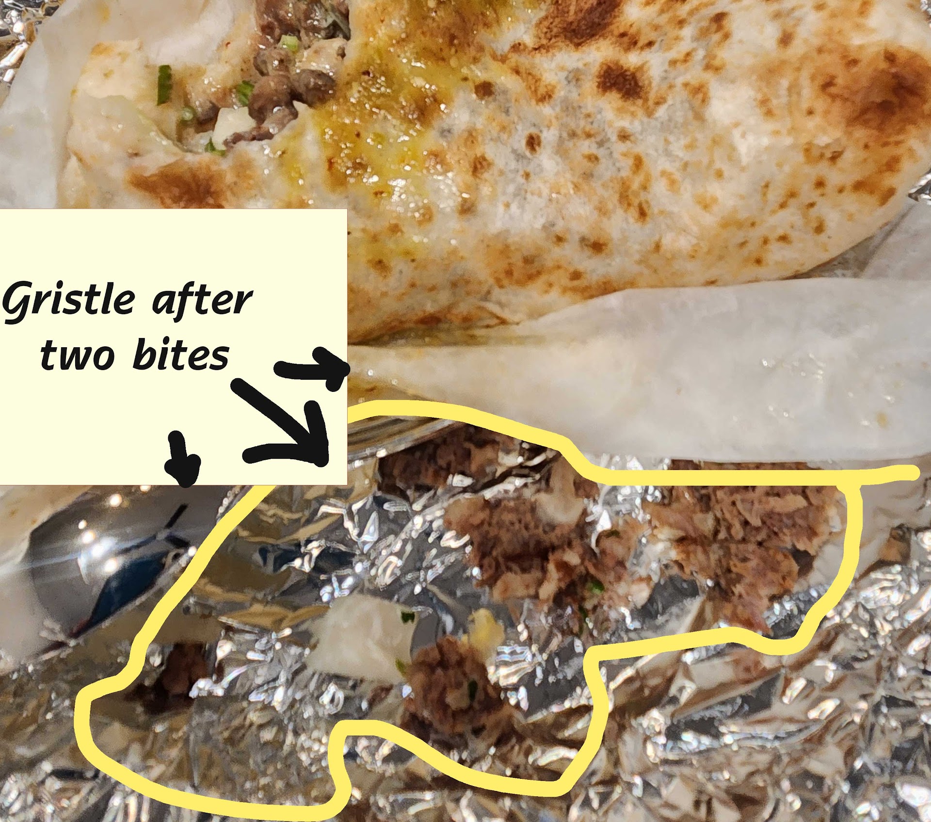 For every bite of my STEAK burrito, I'm spitting out gristle. Really?! You have to be INTENTIONAL and care about whether or not you want to serve your customers/guests the very best. And this burrito said to me, "we don't care about trimming off the inedible parts of our meat", they'll still pay $10.50 for it.