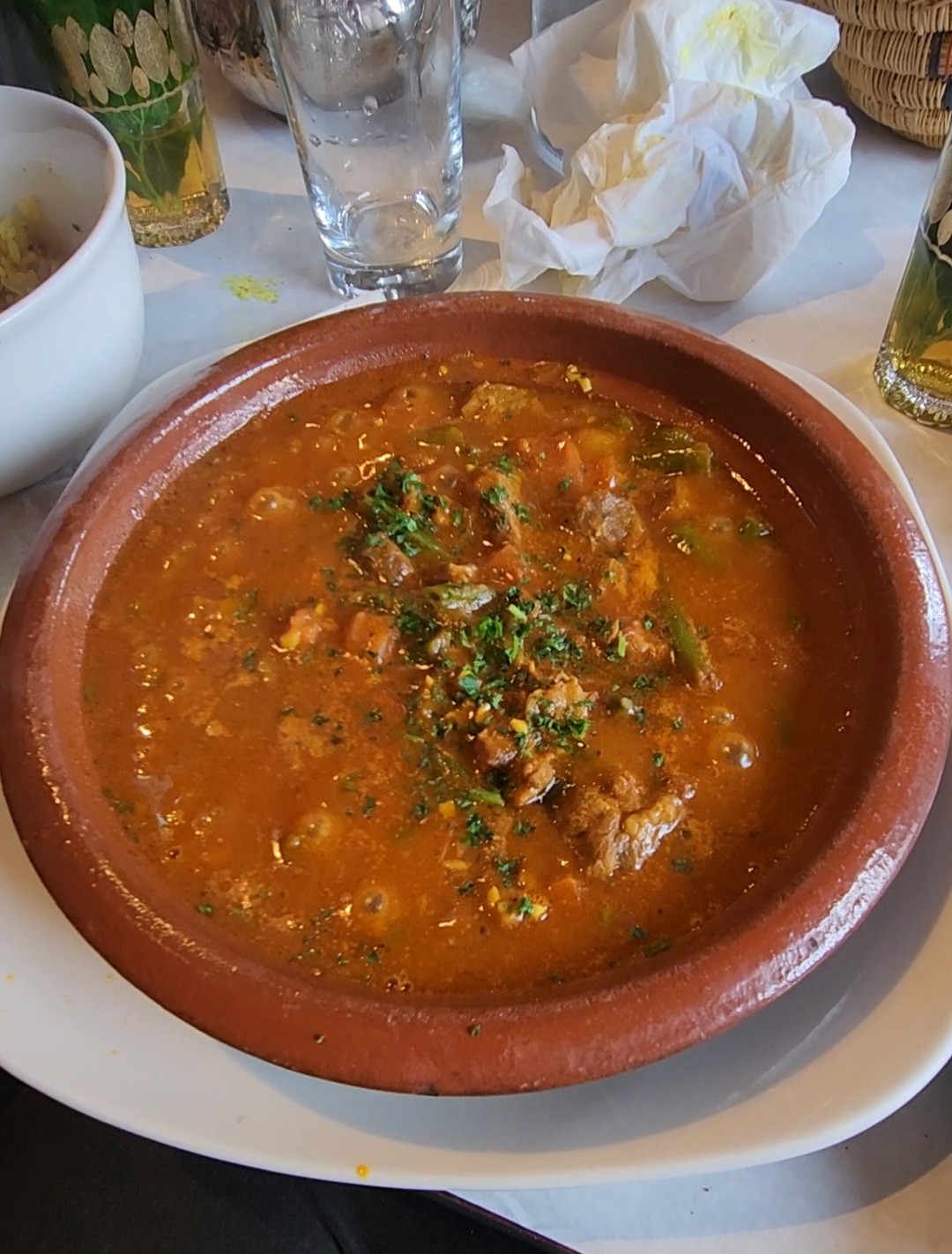 The lamb was unbearably strong and "smelly". I wouldn't be surprised if it was goat as many places use goat instead of lamb because it's cheaper and lamb brings a higher price tag at the table. At least it came in a tagine but was again such a small serving for an over $20 dish, mostly tomato sauce with a small amount of meat and vegetables. We couldnt eat it cuz it was so bad. Once again it was served with rice which is NOT traditional. We had to purchase bread which is what both dishes should have originally came with. The rice also tastes like packaged rice, the pre-made, microwave heated kind.