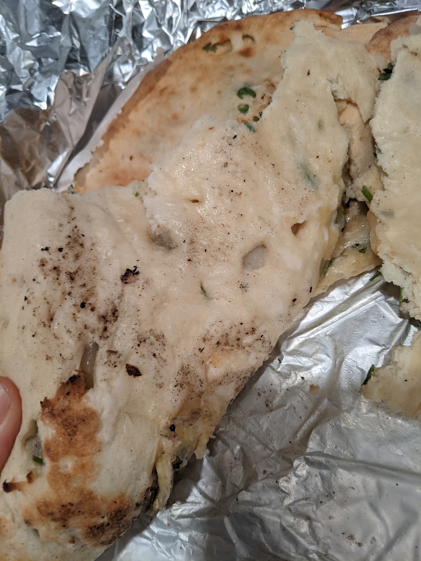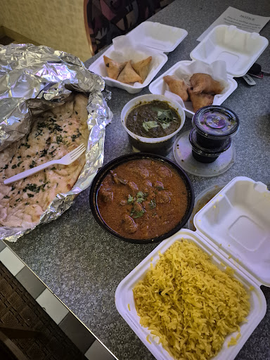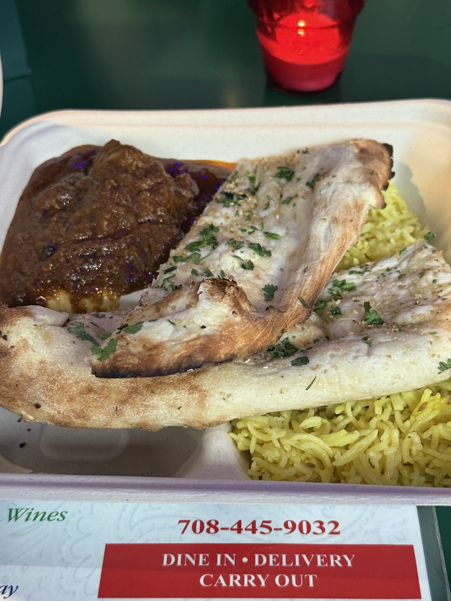 The garlic naan is fantastic. Very flavorful. Also love the saag paneer (spinach and cottages cheese with spices). I only ordered a half order, and you can see in my photo (dark green container) how large the portion size is! I also ordered samosas, keema samosas, and lamb vindaloo. I have never had lamb vindaloo, but this is delicious! Boneless lamb in a very flavorful spicy sauce. They also gave me a generous portion of perfectly-cooked rice, and I look forward to stirring half of it into my vindaloo and half into the paneer.