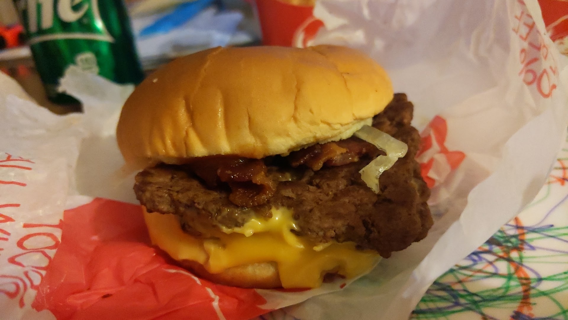 What I ordered was the biggie bag bacon double stack with regular nuggets and fries. What I received was a chicken sandwich that tasted and a smelled like fish. The nuggets were burnt and overcooked, chewing into leather. The fries were the most disgusting foul flavor I had ever tasted in my life and I refused to ever order anything with them again.
