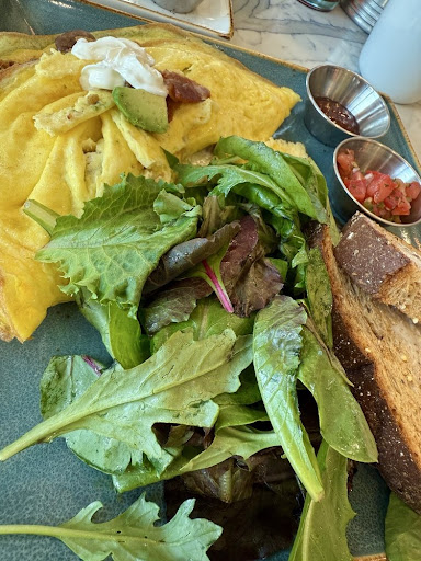 Bacado Omelet — bacon, avocado, Monterey Jack, topped with sour cream, served with house‑made Pico de Gallo, lemon‑dressed organic mixed greens, and artisan toast