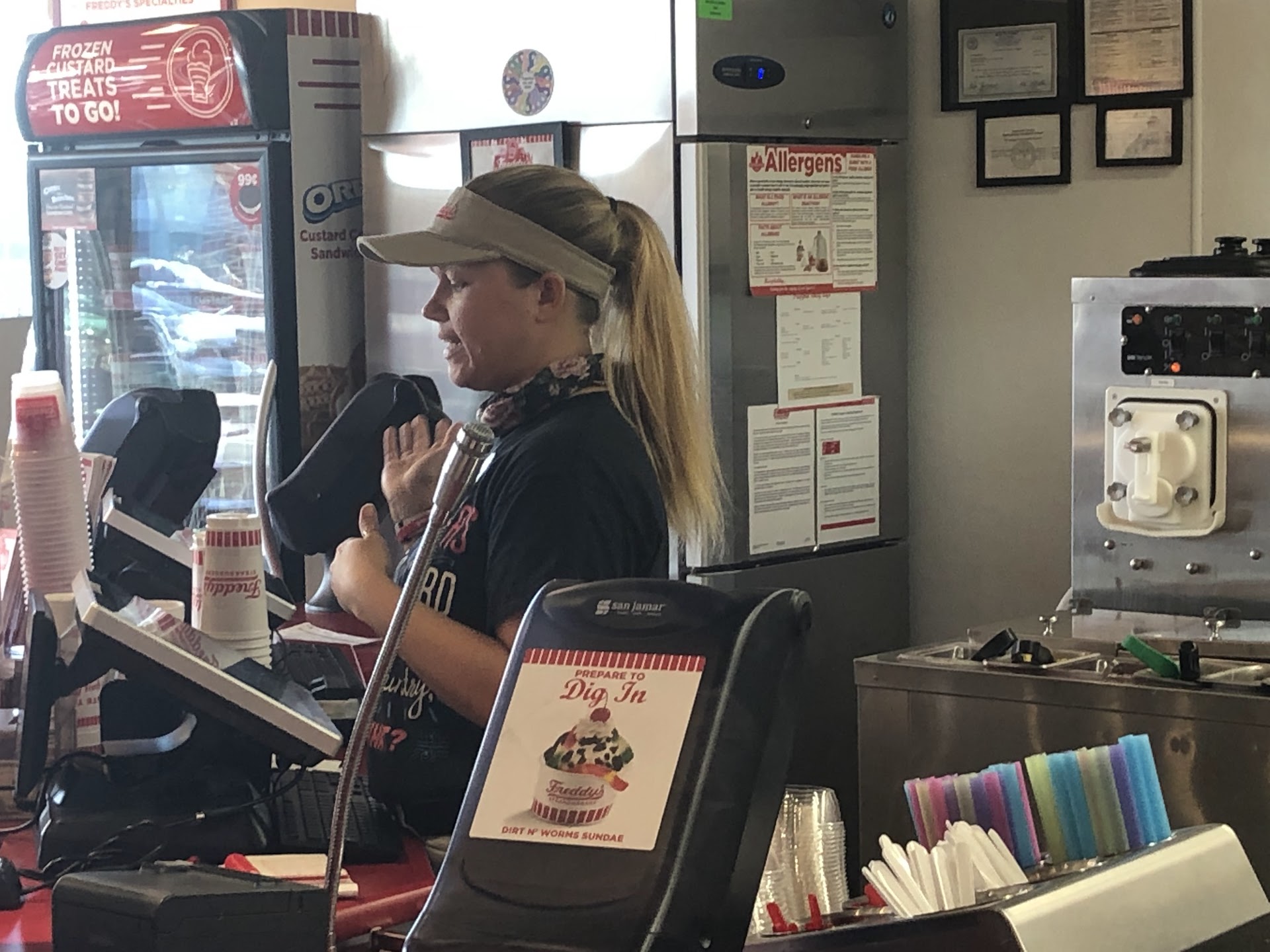 Read moreI went to Freddy's for the 1st time ever May 4, 2019 around 4:00 in Oak Ridge, Tn. Several people had given great reviews, so I figured I'd give it a try. I heard more about the custards than anything, but I was hungry for dinner. I ordered 4 meals (for my family &) & the service was great, the atmosphere was great & the food was good. I was excited to taste the custard, so I went back to the counter to order. I was standing in a long slow line when another employee opened another register. She called me over & I gave my order of 4 custards. She gave me the total & when I went to pay for it, she said "I'm sorry, I'm actually not logged in to the register. You'll have to order in the other line. I'll make sure you're next." By this time 3 more people had entered the line I had left. I stood to the side instead of going to the back, and I didn't want to push myself up front. I was waiting for the employee to call me forward. The employee who waited on me spoke to the other one at the register & told him I was next. He left the register & walked to a booth of employees to say something to them & came back. When he got back, he did not wait on me, but continued with the others in line. I stood waiting for another 7 minutes before deciding to leave. IF I decide to give Freddy's another chance, it WILL NOT be this location! Poor...