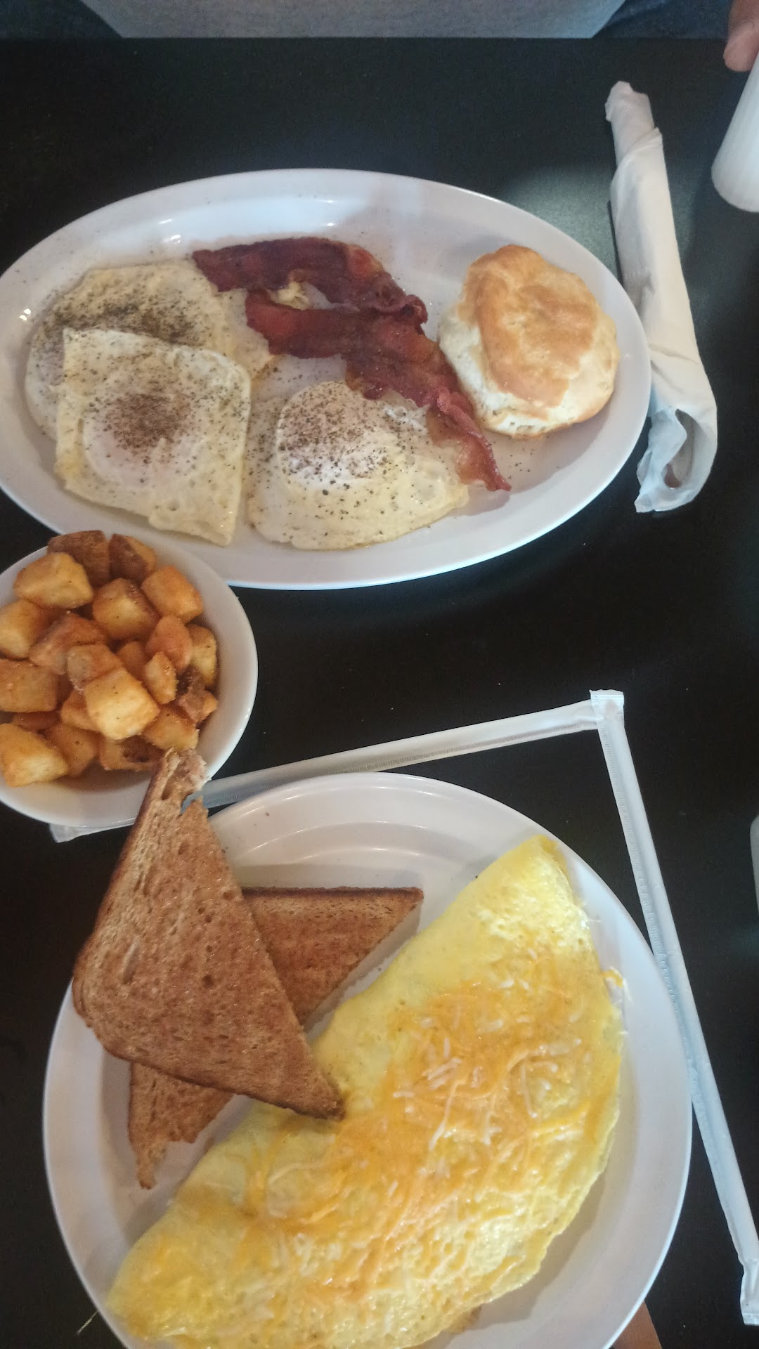 Read moreSo, here is MY experience. *Side note:: prices are AMAZING, But that's it:: It's basically the same as any other breakfast diner. Nothing special. Asked about the oatmeal and was told it's plain bland and they didnt have any add-ins like fruit, nuts, or anything. So I just had sausage and bacon unfortunately because nothing else was interesting or suited to my tastes. I think they could be better than they are. Some changes would help. Like large black serving trays so they aren't parading half the staff to deliver a meal to a table. Menu changes like adding fruit and lighter, healthier options for those of us with a few restrictions. Because I'm sorry but what restaurant doesn't have fruit at all but they have pancakes and waffles which could also use fruit toppings? Unless the server was just mistaken or being unfriendly, which she was nice enough so I don't think that's the issue. If I ever go back I hope some kinks have worked out of their system and they have taken some recommendations about a few things. I do understand that they are a new place, but considering how people are trying to be health conscious and still eat well you would figure some options would be available for us as well. 3/10 but I may go back in a few months and see if I can change the review with a...
