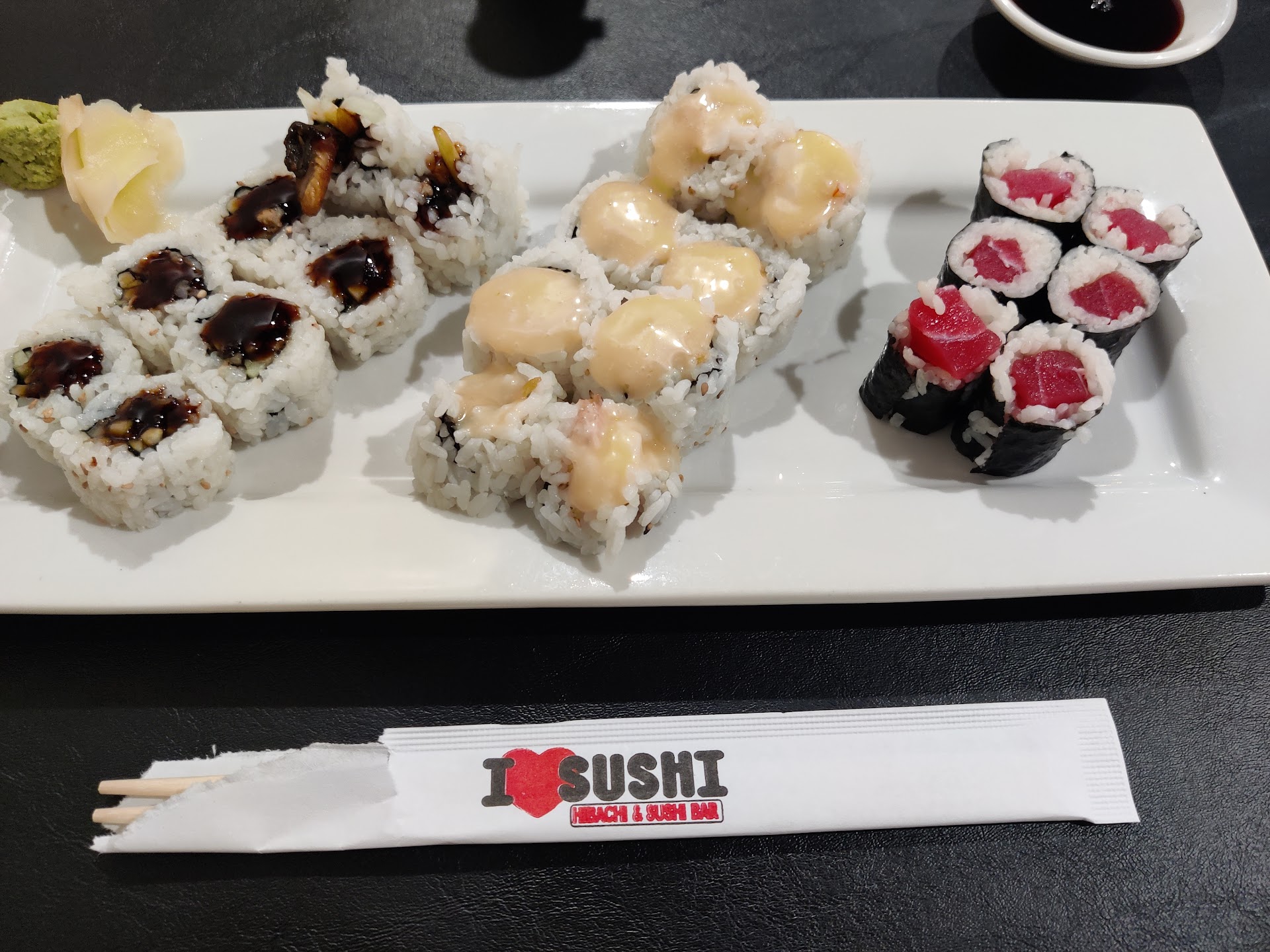 Read moreThis place was absolutely god awful. I was out with my mother and my aunt and we decided we would go and try the place since it was new and my mother and I enjoy sushi. We walked in and for such a small area, it was full. Waited about 5 minutes which was absolutely fine, I had no problem with that. We got sat and our server gave us our menus. After a quick glance, there was NO SUSHI ON THE MENU. I don't mind asking for something however the name of this establishment is "I Heart Sushi" so naturally you would expect Sushi to be on the main menu. Not so long after that, a young lady came to us to take our drink orders. My Aunt ordered a Diet Pepsi, Mom ordered a Tea, and I ordered a Pepsi. A few minutes later the lady came back to give us our drinks. I was on my phone so I had waited a few minutes before beginning to drink my beverage. When I took a sip of my drink I realized it was my aunt's diet Pepsi. I asked her if she had mine and we switched however, they had given us 2 diet Pepsi's. When we ordered, my mother and I decided on 4 sets of rolls. The Crunchy Crab, Crunchy Shrimp, Cupid and another one I can't remember, my mother also ordered a Tempura appetizer. My aunt got some sort of rice and steak combination with a salad. After a 25 minute wait (that is far to long for 4 rolls and a steak and rice dish) we finally got our food. My aunt didn't get her salad so she asked for it and after another 5 minutes they brought it out to her. The sushi was far from stellar and for the price (around 45 dollars) it was no where near worth it. When we were finished, we got our check. They had put the Tempura on the bill however we never revived the dish. After a 10 minute wait for them to take the tempura off our bill, we left. All in all a 1 star experience considering the drink debacle as well as the food and the price for the food being far to much for the quality of the food. If I wanted to go out to dinner with my mother and get some sushi, we would go to Fulin's Asian Cuisine down the street because for the same price that we payed for 4 bad sushi rolls at this establishment, we could get 2 bowls of soup, 2 egg rolls, and better sushi. Would...