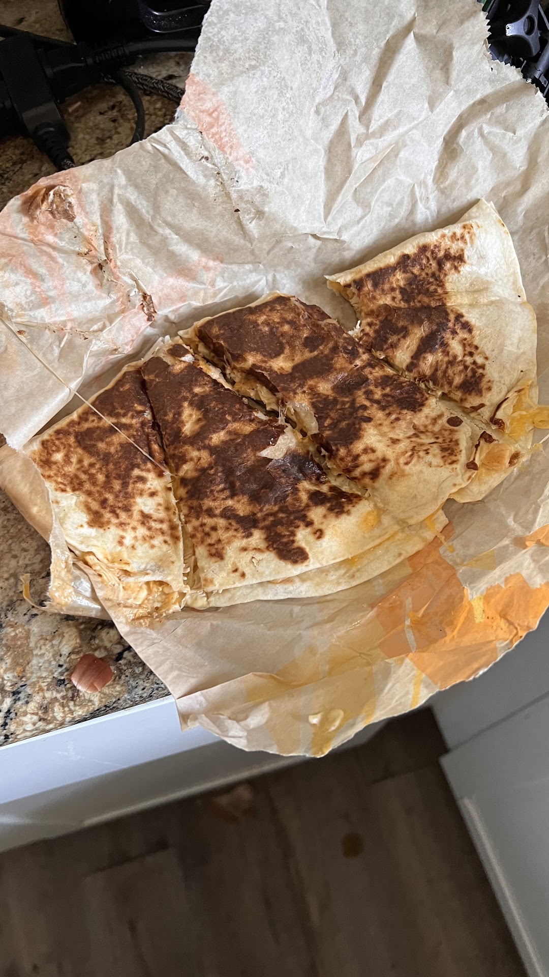 This Taco Bell was not busy at the time we were there and now I know why. The staff was EXTREMELY rude to us. For starters, we ordered $35 worth of food. When they handed it to us, we checked the bag just to make sure it was all there. I said very politely that I think we were missing two tacos. She insisted multiple times that it was all there. I asked if she wanted to double check and handed back the bag. They counted the tacos and were throwing them into another bag. A different employee rudely handed me the bag and said “it’s all there” but then added the two tacos in a small bag on the top. So they WERE missing the two tacos and were being rude to me for asking for them. They also gave us ONE taco sauce when we specifically asked for sauce…. for $35 worth of tacos. So again, they did it to be a**holes. The food that they gave us was literally just tortillas and no meat whatsoever! We will be taking our business elsewhere in the future, I advise you to do the same! The other Taco Bell in town is literally 5 minutes down the road! (Pictures are a chicken quesadilla and...