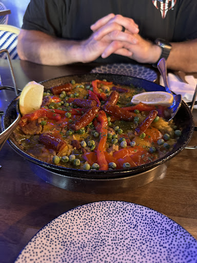 When the dish finally arrived, it was placed on the table and the server (not ours) simply walked away. It appeared beautiful to look at and we were eager to begin eating. I took a small spoonful and found the rice burned and stuck to the cast iron pan. No way to get it off to enjoy the crispy edges- so no crispy rice edges. The rice was just about flavorless. I was shocked. There were peppers and a few chunks of chicken, and what appeared to be Slim Jimâs cut in half and placed on top. The menu had stated it contained rib meat, chicken, and chorizo. My guess is the rib meat was forgotten, and the slim Jimâs were the chorizo. I will say that out of the whole dish, the slim Jimâs were the only thing with any flavor. The entire dish was mostly flavorless. Not at all like the other paella I had previously. A huge disappointment. There was a young lady that came in to play the electric violin, and it was nice, albeit a little too loud. The water glasses got filled once, and the check took a lifetime to come. All told, we were there for almost 2 hours. The paella for 2 was $50, and the dish was so small that I left hungry. Nothing came with the paella, no type of salad or tapas plate or anything.