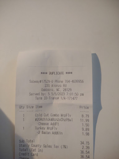 Read moreI stopped going to the Oakboro location over a year ago. Each time I go I get same sandwich; however, it is a different price each time and neither reflected the true price on the menu. I ordered a steak n cheese on my last visit. It was so old and had been in the warming bin so long it was tough and crunchy! You can’t use coupons or reason with the owners. They give you one napkin for each order whether you buy one sandwich or 3. My husband ordered a salad and the lettuce was so old it was brown and slimy! They were out of dressings and didn’t tell us until we had the bag in our hand and out the door. Had to go next door and purchase dressing!!!! This location in Oakboro does not follow the franchise standards. One more thing…the drinks are so watered down with carbonated water you can’t even taste the type of drink and the tea is usually soured! I figure it stays in the tea urn overnight. I will not...