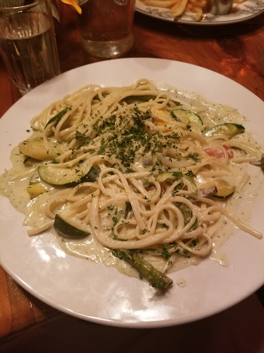 Ā Ā Ā Read moreI had the chicken wings and the fettuccini pesto-alfredo. Both were strange. The wings: I've never seen wings with such thick breading. And they left the skin on which means under the thick coating of breading there was a soggy layer of fat and skin that couldn't crisp up due to all the breading. The flavor was decent, however surprisingly salty considering they were served with an array of sauces on the side (buffalo, bbq, and what may have been blue cheese). Why did they need to be so salty if they're meant to be dipped in sauce? The fettuccini pesto-alfredo: Even worse than the wings. I dont think they should even be calling it an alfredo sauce. It was more of a cream sauce with a decidedly soupy consistency. There was a green tinge to the sauce but since it didnt taste much like pesto, I assumed it was just from the finely minced green stuff on the top (looked like parsley?). One of the dishes and one of the knives at the table were dirty, which I swapped for clean ones from another table (it took me two tries because the first one I grabbed was dirty too). I liked the decor and ambiance, but with such a nice atmosphere and such high prices, I had been expecting a higher...