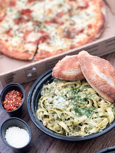 I got the Philly pizza and Amici’s Combo pizza, the bbq chicken wings, and fettuccine with pesto and clams.