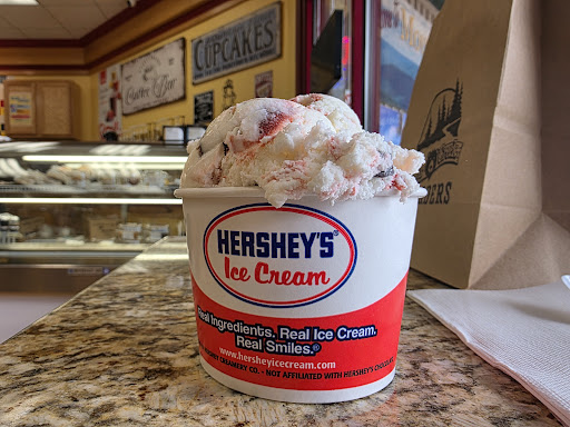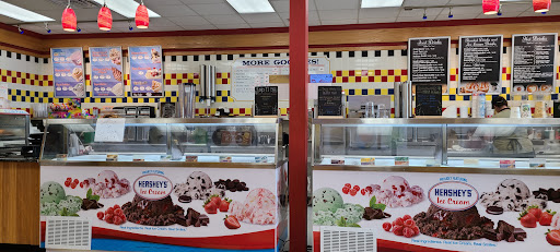 The inside is super clean and cheerful, with a fun red, yellow, and burgundy tiled floor, bright red pendant lights, and a retro soda fountain vibe. There’s a long counter full of Hershey’s ice cream options, plus a full coffee bar with lots of syrups and a smoothie menu. Several tables inside make it a great place to take a break and enjoy your treat.