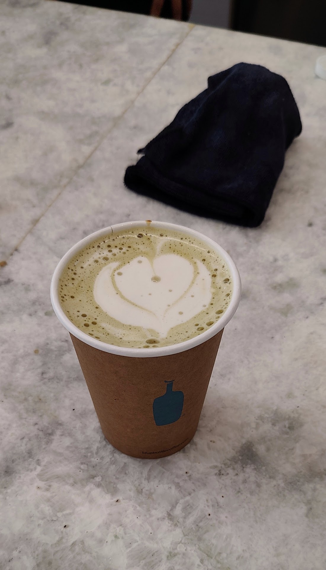 I drank my matcha latte down to the last drop and, upon removing the lid after, did not find any little stray remaining chunks of matcha like you might find in Starbucks' matcha lattes, which are shaken and foam up like crazy. The non-dairy less so, but there is still an obvious layer at the top in Starbucks iced matchas. Not to be found in Blue Bottle Coffee's, which makes the sipping experience very simple and enjoyable.