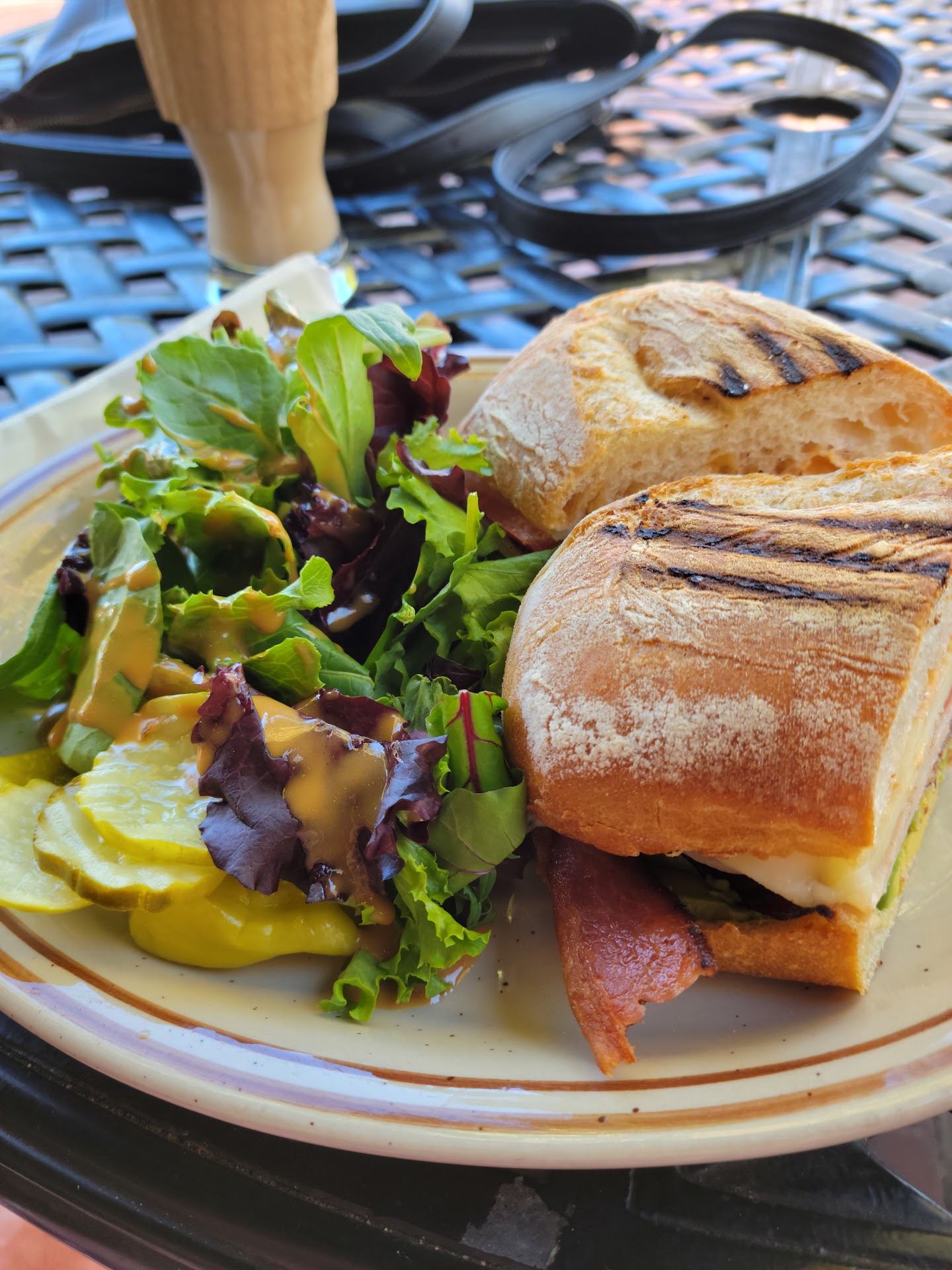 They had a nice selection of pastries that all looked good but I was here for lunch. I grabbed a menu which had a lot of options available. Pasta, pizza, breakfast foods, sandwiches and panini's. I ordered a double latte and the turkey and bacon panini. After getting my latte I headed out to the back patio to await my food.