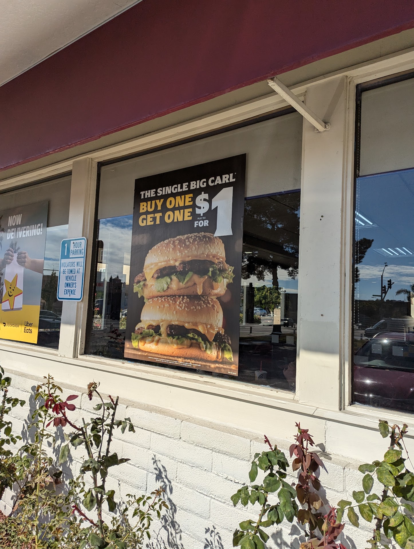 The food is the usual Carl's Jr. fare, so you can form your own opinion. I will say that the fries are among the best in the business--but they won't taste as good cold when you have to take them home before eating.