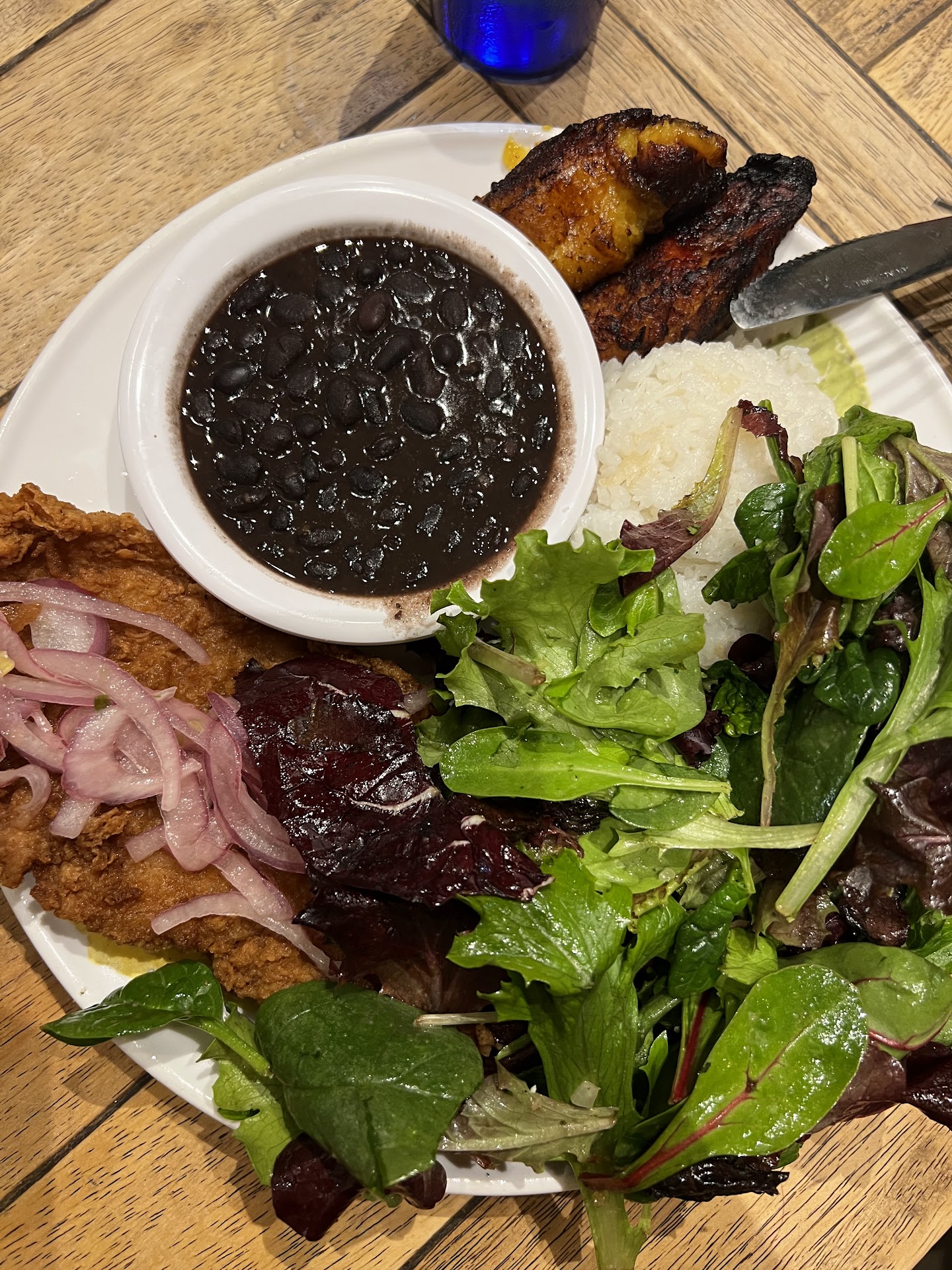 During my first visit I decided to get the Chicharron de Pollo ($12.65) which as per the description in the menu is crispy pieces of free range chicken thighs topped with salsa criolla served with rice & black beans, organic salad and sweet potatoes, to-go. After ordering I was given one of the fancy locator beacons that light up when your order is ready and guide the server to your location. As they were swamped it took about 20 minutes for the food and I was on my way.