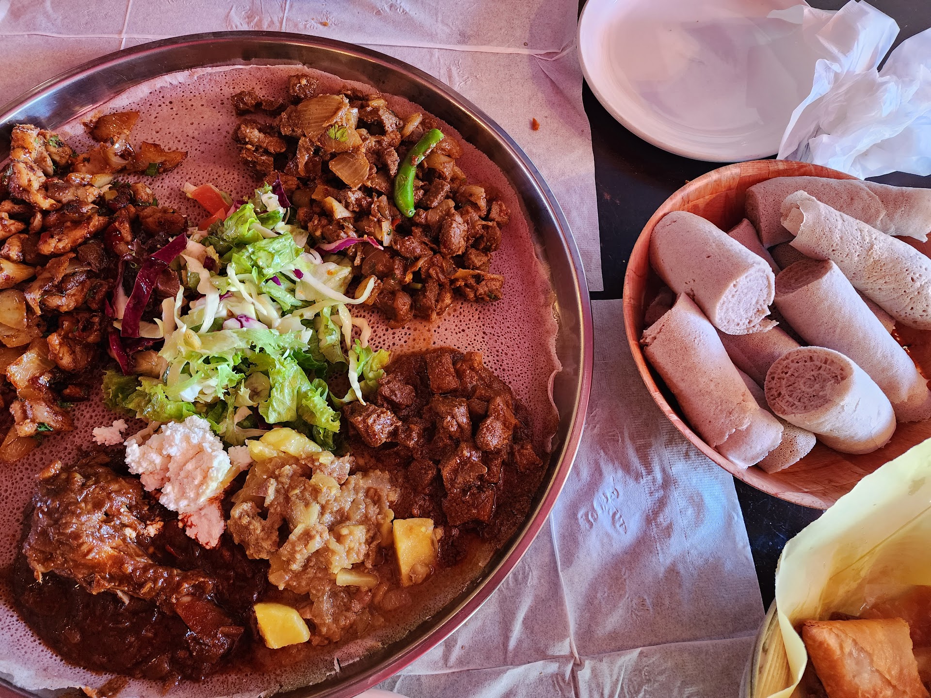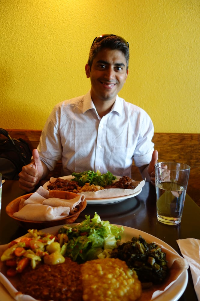 My husband and I always order a vegetarian platter to share, with the vegetarian sambusos, but I have ordered the meat platter and other a la carte items to share with family when they visit. There is plenty of food, and you can always ask for extra injera, which is no extra charge.