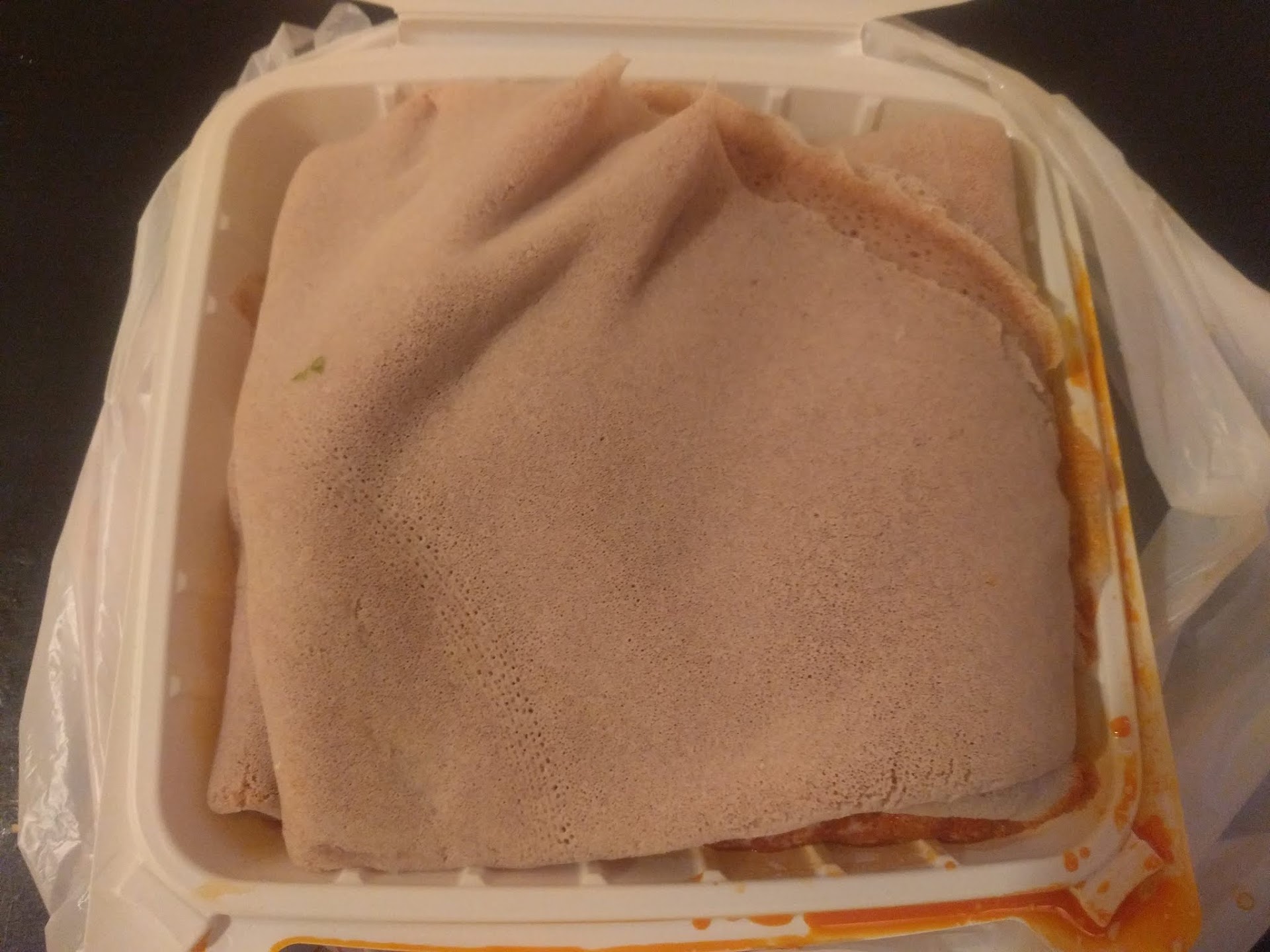 I got a one decent sized container which meant that the injera was placed on top of the meat dishes meaning that by the time I got home it would absorb all the moisture for the stews and become nice baby food. I should have asked for it to be packed separately but the person taking my order was not the type that would appreciate special requests so I just let it pass. Note to self – order online next time and request that they injera be packed separately.