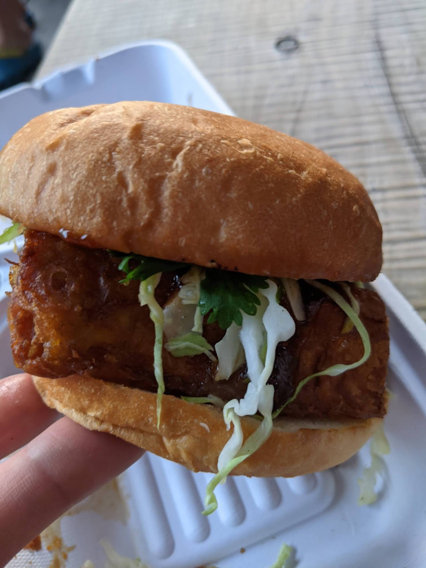 My partner had the BBQ chicken sandwich with rich, dark, smoky tamarind sauce and bright pickles and fresh herbs and mint leaves. The blistered green beans with bacon and Prik Khing curry were life-changingly good. And the tots with secret seasoning (lemon grass?) Ooh, la, la!