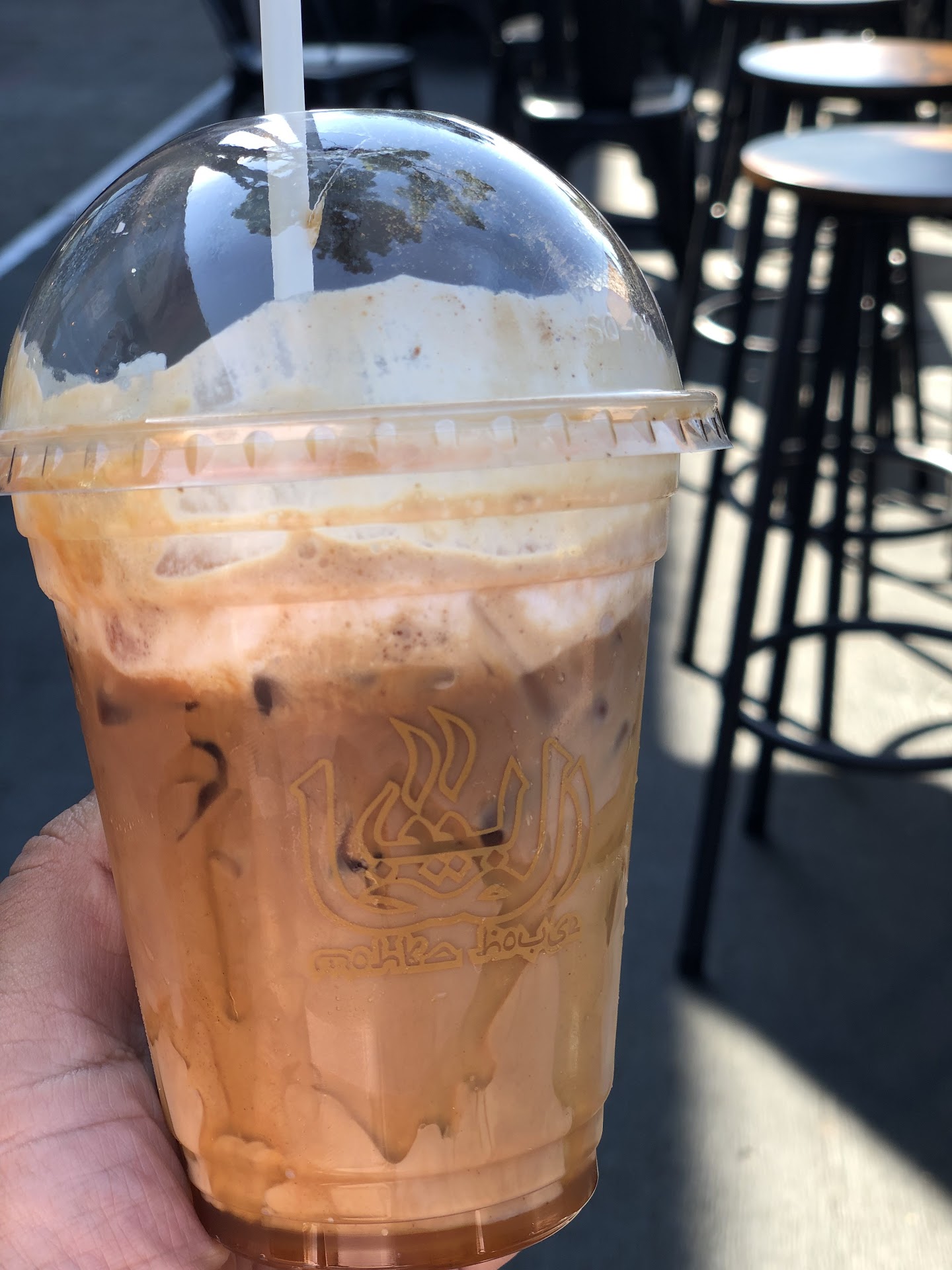 Additionally we each ordered a slice of Khaliat Alnahl (Honeycomb Bread), with additional honey drizzled on top. Also amazing. The sizes were really big and we thought we'd be taking some home....but nope. We each had no problem finishing our own. The whole space is beautiful with quiet music playing in the background...we sat in the window facing in towards the restaurant and just enjoyed the calming decor, music, and amazing food and drink. As we were leaving both of the young men working in the front were sure to say goodbye and thank us for coming.