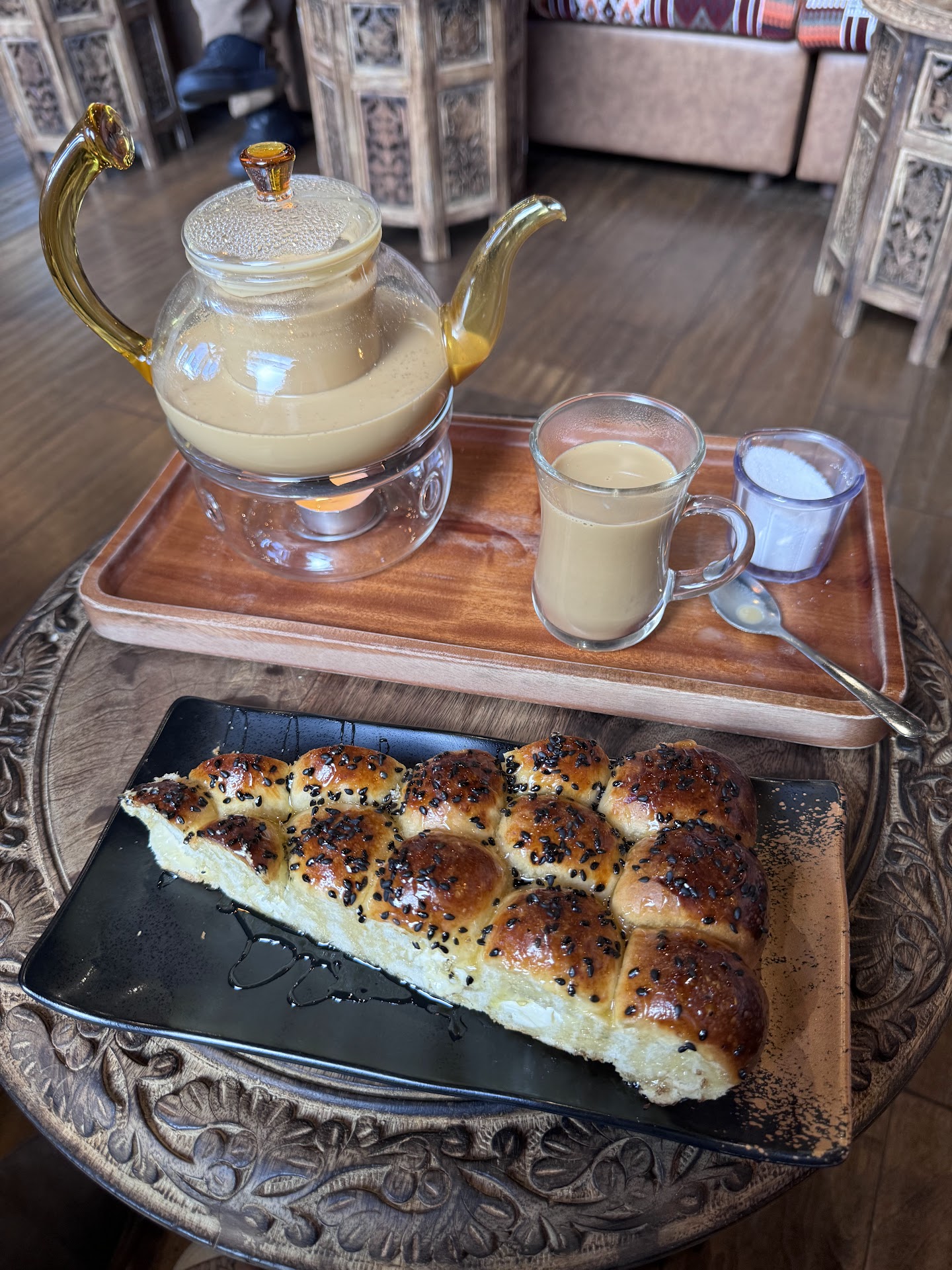There are so many great options here that I will absolutely be making this my regular place when I want to treat myself to coffee outside my home.What a beautiful space this is and so welcoming! Stopped in Tuesday morning 9am-ish and was in awe of all the flavor choices for both coffee and food. There is tea and many, many options, but I didn't have any on this visit. The flavors are all right up my alley, so it was a no-brainer for me to get the Pot Service of Mofawar - cardamom and cream. Convinced hubby to share the 18oz pot with me. It was absolutely perfect...it stays warm in it's glass serving pot, and one can add sugar to their cup or not. While hubby enjoyed it, he's not as passionate about cardamom as I am, so I drank 3 cups to his 1 cup. Don't get me wrong - he liked it very much, but he would choose a different flavor profile next time. So just for reference, the 18oz pot handily serves 2 and you could possibly squeeze a 3rd person into sharing it...but you won't find ME doing that lol.