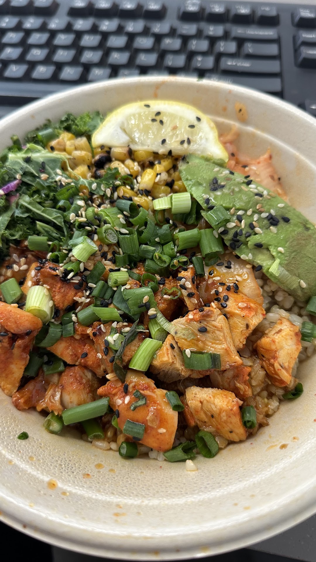 We ordered the tofu bowl and cauliflower bowl with a side of chicken. Weāve narrowed it down to either the chicken or the sauces since those were the only similarities between our meals.