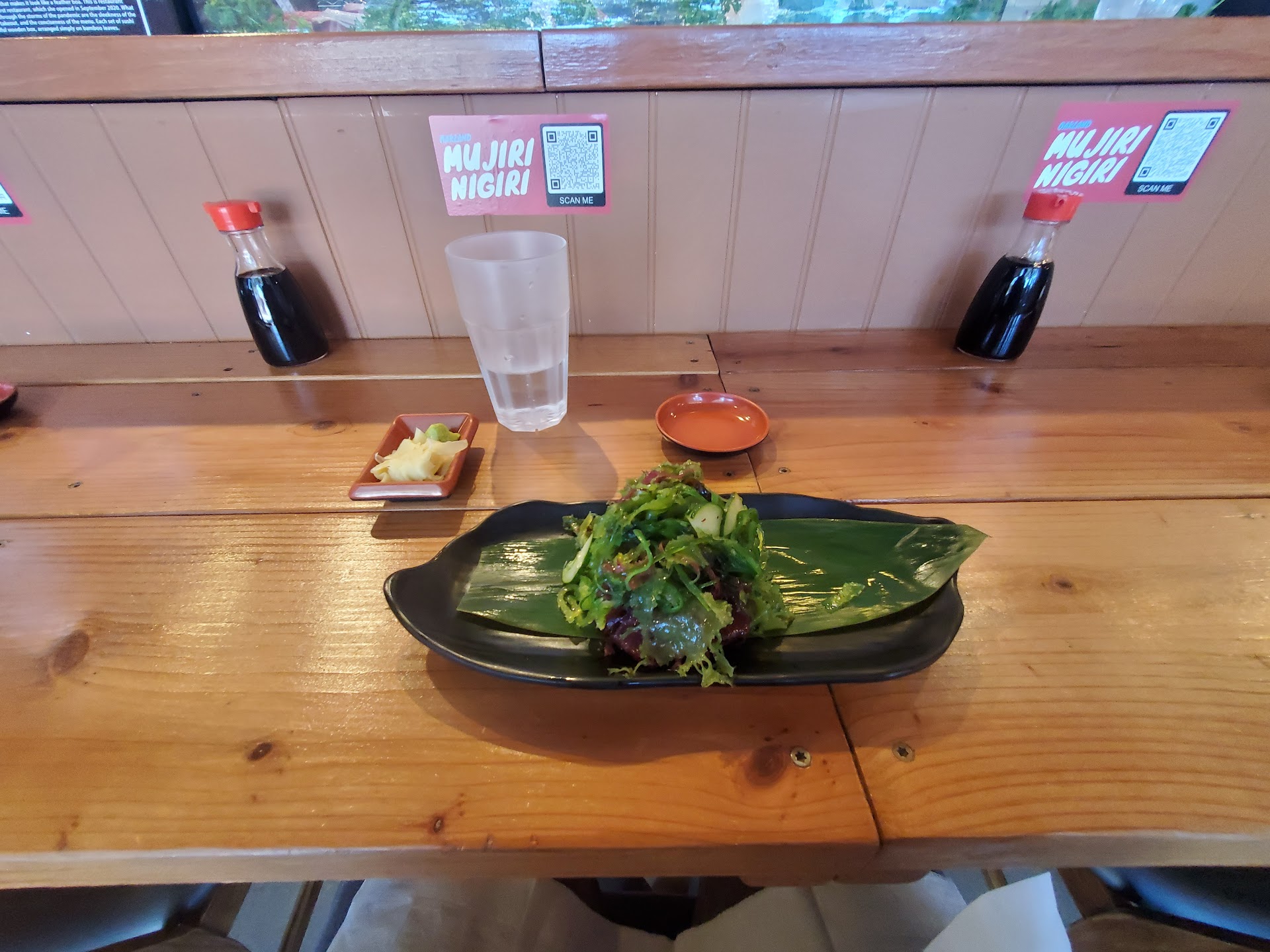 I saw an article about Mujiri in my newsfeed and decided to drop in for the $25 nigiri combo. Parking was easy on the side of San Pablo Ave. I was pleasantly surprised by the calm, welcoming atmosphere with nice music. Staffing included two sushi chefs one hostess, and one waitress. A qr code for their daily menu was available to scan, which brought up a small, but enticing menu. I ordered the seaweed salad and chefs choice nigiri combo, and chose to add 1 beak fish since I have never tried it before. The salad was presented first. It was delicious, with citrus and sesame notes. As I finished my glass or water, the the hostess provided a refill within 5 seconds. She was on her game, which is something I appreciate when dining out. The nigiri was brought out next, and she let me know which fish were on my plate. I was delighted when I noticed nikiri sauce painted over the top of each selection... that's something you don't see at many sushi places and tells me I do not need to dip my nigiri in soy sauce and Wasabi. The nikiri application was subtle with a few small drops hitting the simple bamboo leaf on my wooden plate. Next to the nigiri was a 6 piece tuna roll. I started with the nigiri from right to left. I was so excited to dig in I accidentally ate the Toro nigiri before I snapped the photo in my review. It was soft and buttery, and the small dab of Wasabi in between the rice and fish was perfect. The roll came next. I decided to to dip it in a small amount of soy, with wasabi to add an extra kick. The hostess approached me and asked if I needed anything else, which I declined because the serving size was perfect. I paid my tapping my phone on a portable terminal and added a 25% tip, which I am happy to give when I receive 5 star service. I left full and happy. I found my new spot and will return again, plus will tell everyone I know about this amazing bay...