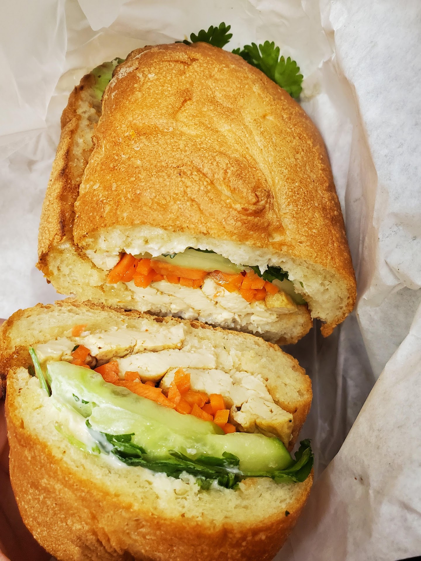 As a 9-year vegetarian, their tofu banh mi is one of the best I've ever had. The veggies are fresh and let me tell you -- they do NOT skimp on bread quality. Have you ever had Semifreddi's bread? (Think: fresh baked bread shelves at Berkeley bowl) Well, that is the bread you'll get with the banh mi and it is perfection (not like the styrofoam vehicles for veggies that you might get from other spots).