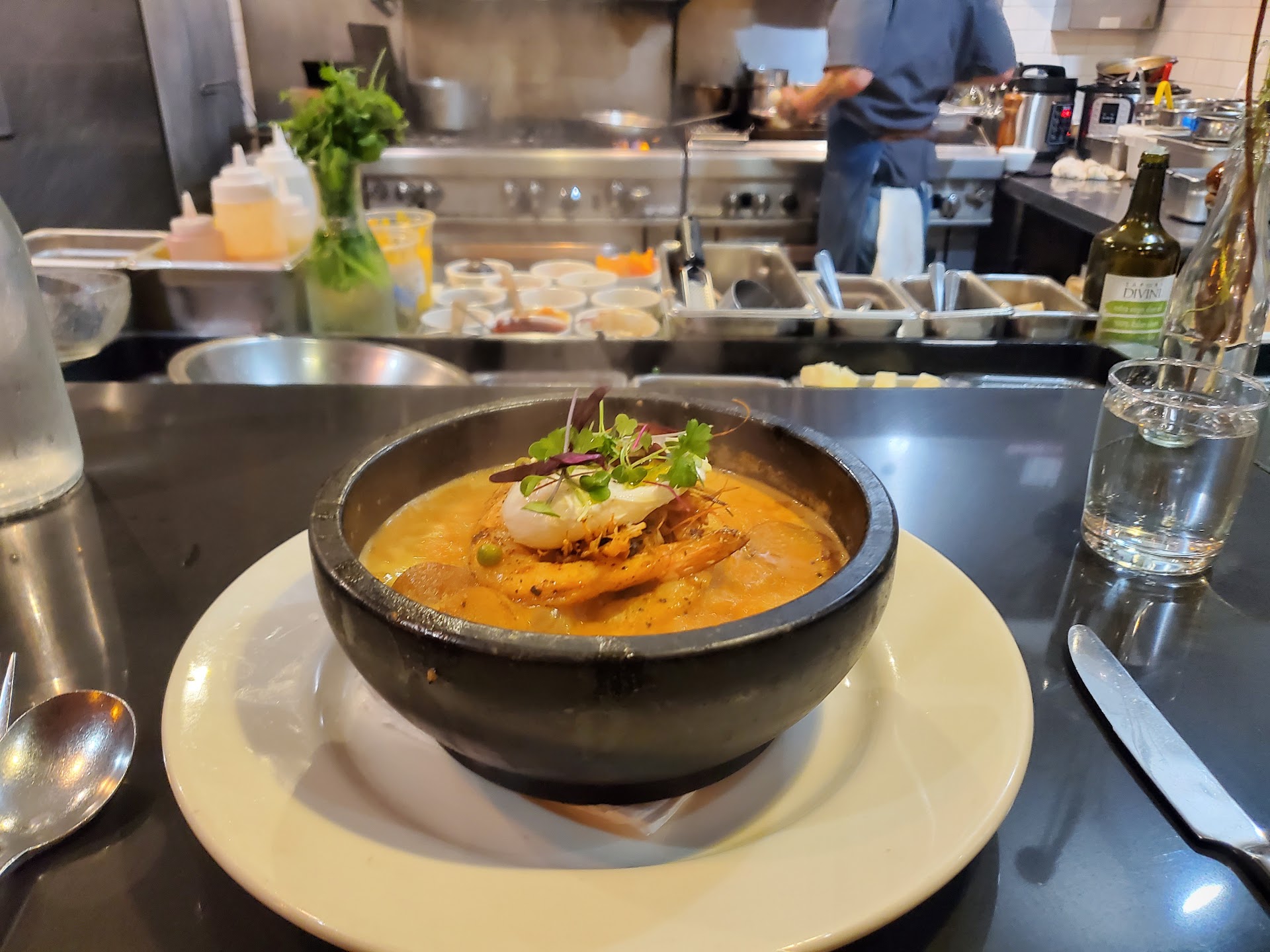 I sat at the bar, and though you might not get quite as intimate attention from the server as from the tables if it is incredibly busy (he was stretched thin the first evening I was there), I found it to be perfect, as it gave me a front row seat to the chefs working their magic. All of the staff was incredibly warm and friendly, the server/host Kevin did an amazing job of making me feel welcomed, and was quick to address anything I brought up with him. Miguel and Rocco were the chefs and they both treated me quite well. As I chatted with them and let the chowder cool a bit, our conversation was like that of old friends catching up with each other. I felt right at home with these guys.