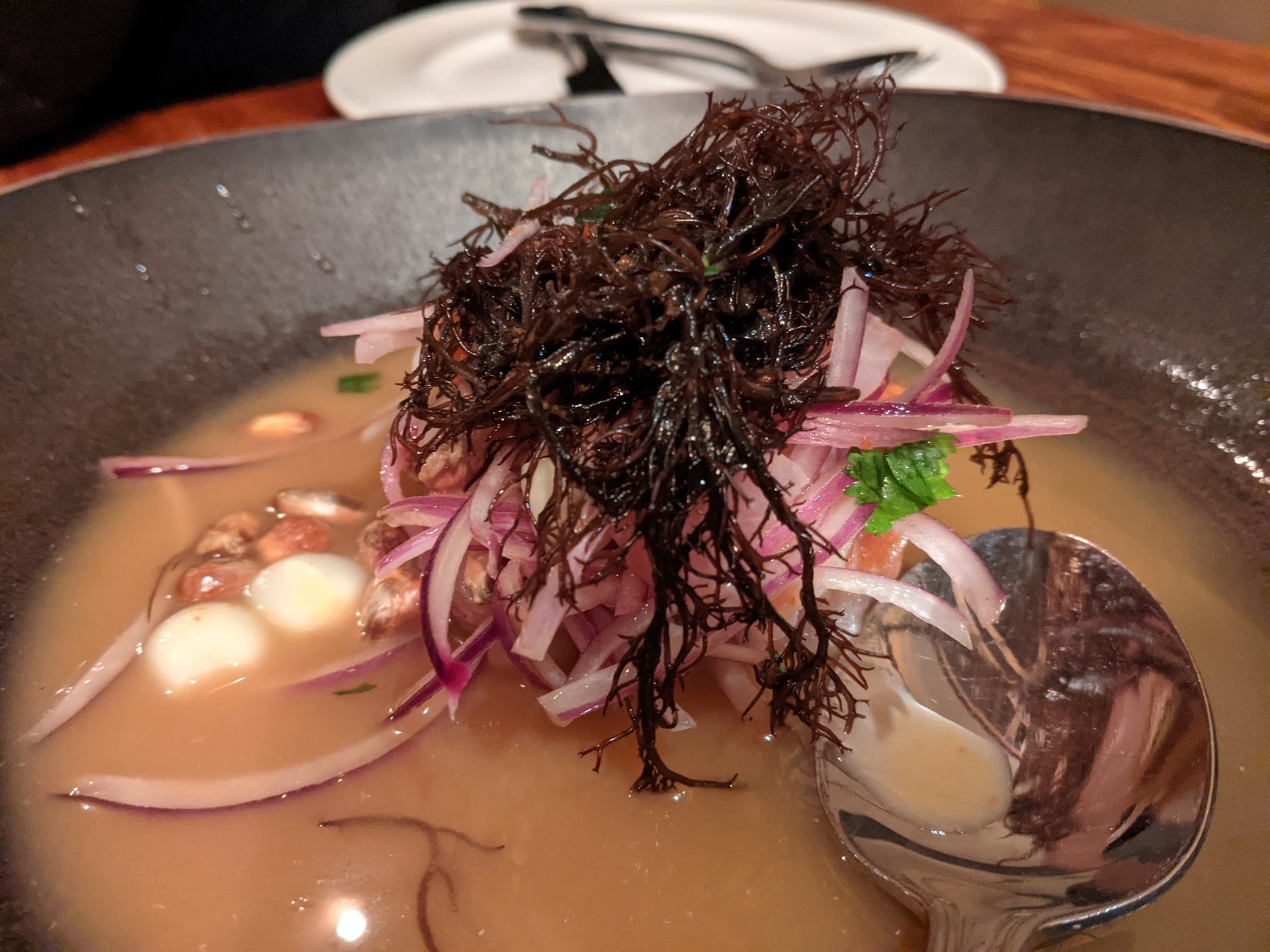 **On my second visit, I invited a friend and these guys treated us like family friends! Everyone was in a great mood, my friend and I each ordered the chicharron (it was too tasty to share any more than just a bite!), and while she ordered the Chupe de Camarones (and LOVED it), I ordered the Tacu-Tacu de Mariscos, and we both had Chicha Moradas to drink. These guys really took care of us, made us feel right at home, and made the night a lovely one!