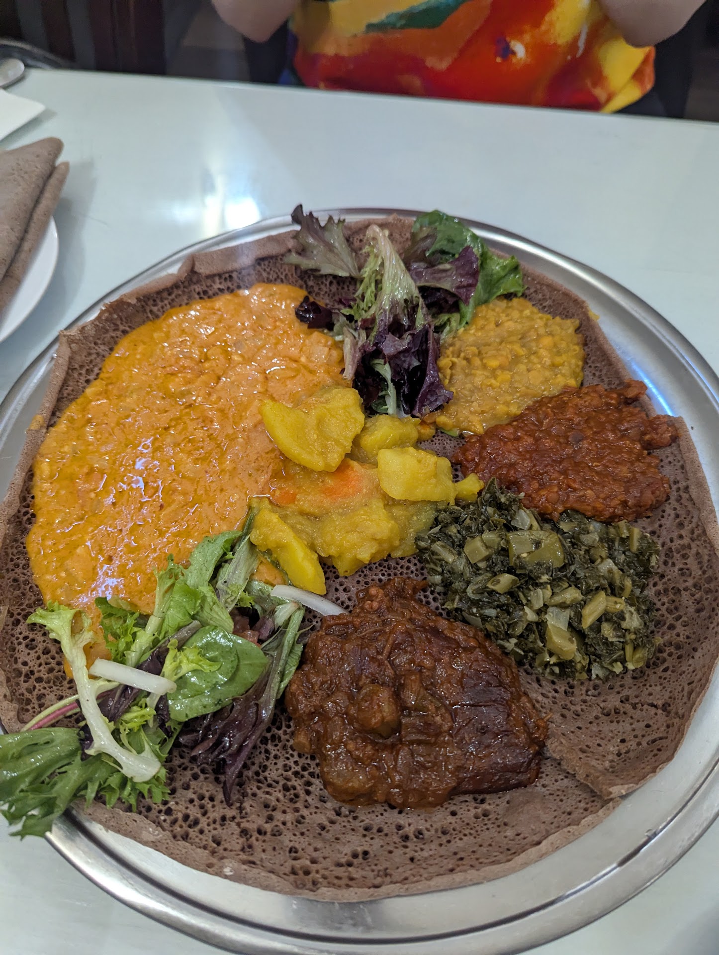We got the vegetarian sampler and the shiro. The discordant artwork on the walls and the lack of detail was reflected in the plate too. The potatoes and carrot pieces were too big and underwhelming. The shiro took a while to grow on me, but it definitely has a lot to address. The shining jewel was the okra in tomato sauce. If only the pigeon peas and red lentils were as flavored this would have been a good experience. The collard greens, as is the case in all Ethiopian restaurants, was...