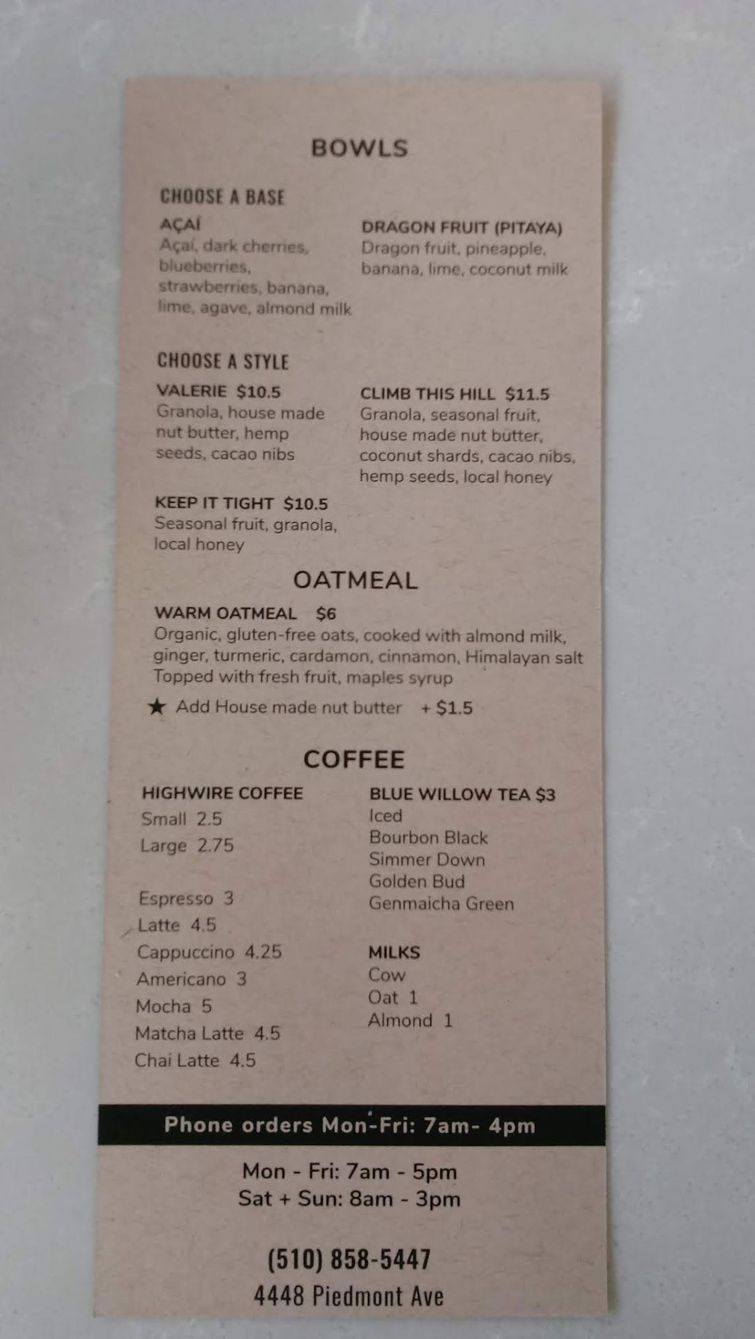 • Almost all plant-based. Vegans: just check for honey. • Almost all made from scratch (down to the nut butter). • Coffee from Highwire and tea from Blue Willow • The menu says “Organic and Woman Owned” at the top but it wasn’t clear which ingredients are organic (besides the oats which are listed as organic on the menu). Would be good to get some clarity on that as it’s a prominently displayed selling point. Giving the benefit of the doubt for now ;) • Woman-owned business. • Waste reduction: they have mason jars prominently displayed at the counter, on sale for $3 each.
