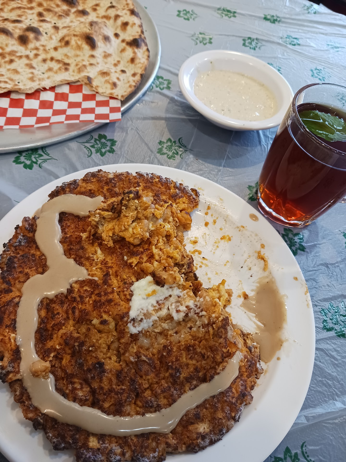 The breakfast dish pictured is eaten using hands. The flavor combination is somewhat similar to other Middle Eastern countries, but in my experience, it's sufficiently distinct to pique my curiosity. The tea is heavily cardamom flavored.